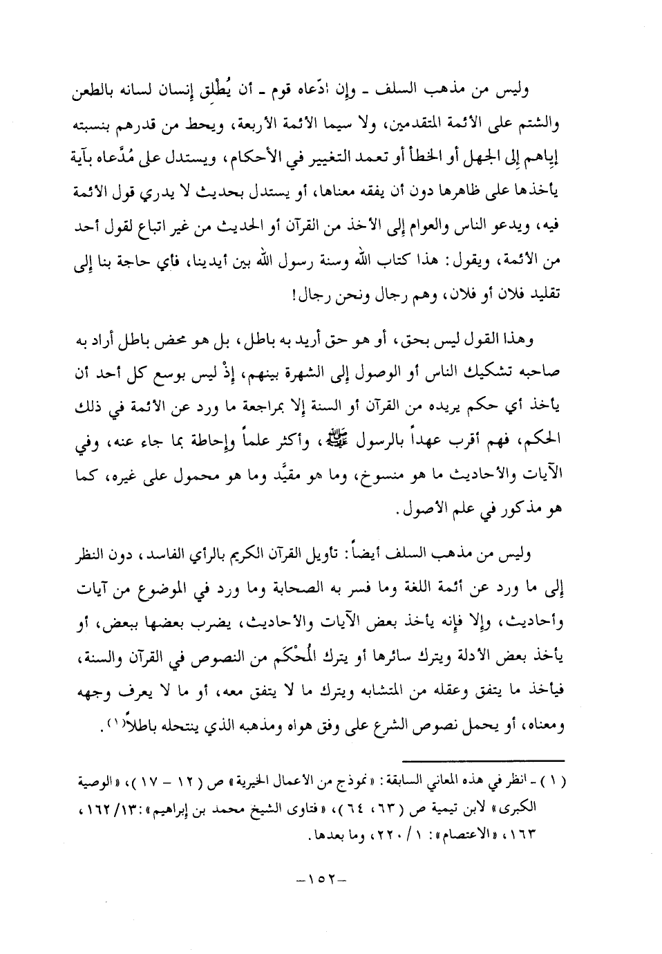 وليس من مذهب السلف -وإن ادعاه قوم- أن يطلق إنسان لسانه بالطعن والشتم على الأئمة المتقدمين، ولا سيما الأئمة الأربعة، ويحط من قدرهم بنسبته إياهم إلى الجهل أو الخطأ أو تعمد التغيير في الأحكام، ويستدل على مدعاه بآية يأخذها على ظاهرها دون أن يفقه معناها، أو يستدل بحديث لا يدري قول الأئمة فيه، ويدعو الناس والعوام إلى الأخذ من القرآن أو الحديث من غير اتباع لقول أحد من الأئمة، ويقول: هذا كتاب الله وسنة رسول الله بين أيدينا، فأي حاجة بنا إلى تقليد فلان أو فلان، وهم رجال ونحن رجال!