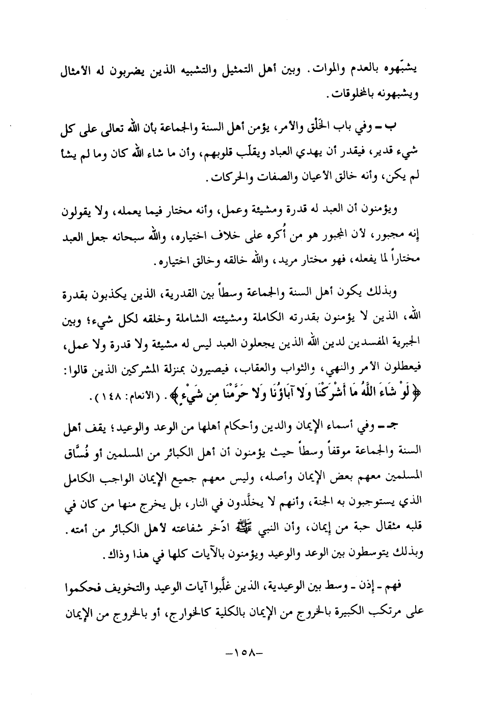 وبذلك يكون أهل السنة والجماعة وسطا بين القدرية، الذين يكذبون بقدرة الله، الذين لا يؤمنون بقدرته الكاملة ومشيئته الشاملة وخلقه لكل شيء؛ وبين الجبرية المفسدين لدين الله الذين يجعلون العبد ليس له مشيئة ولا قدرة ولا عمل، فيعطلون الأمر والنهي، والثواب والعقاب، فيصيرون بمنزلة المشركين الذين قالوا: