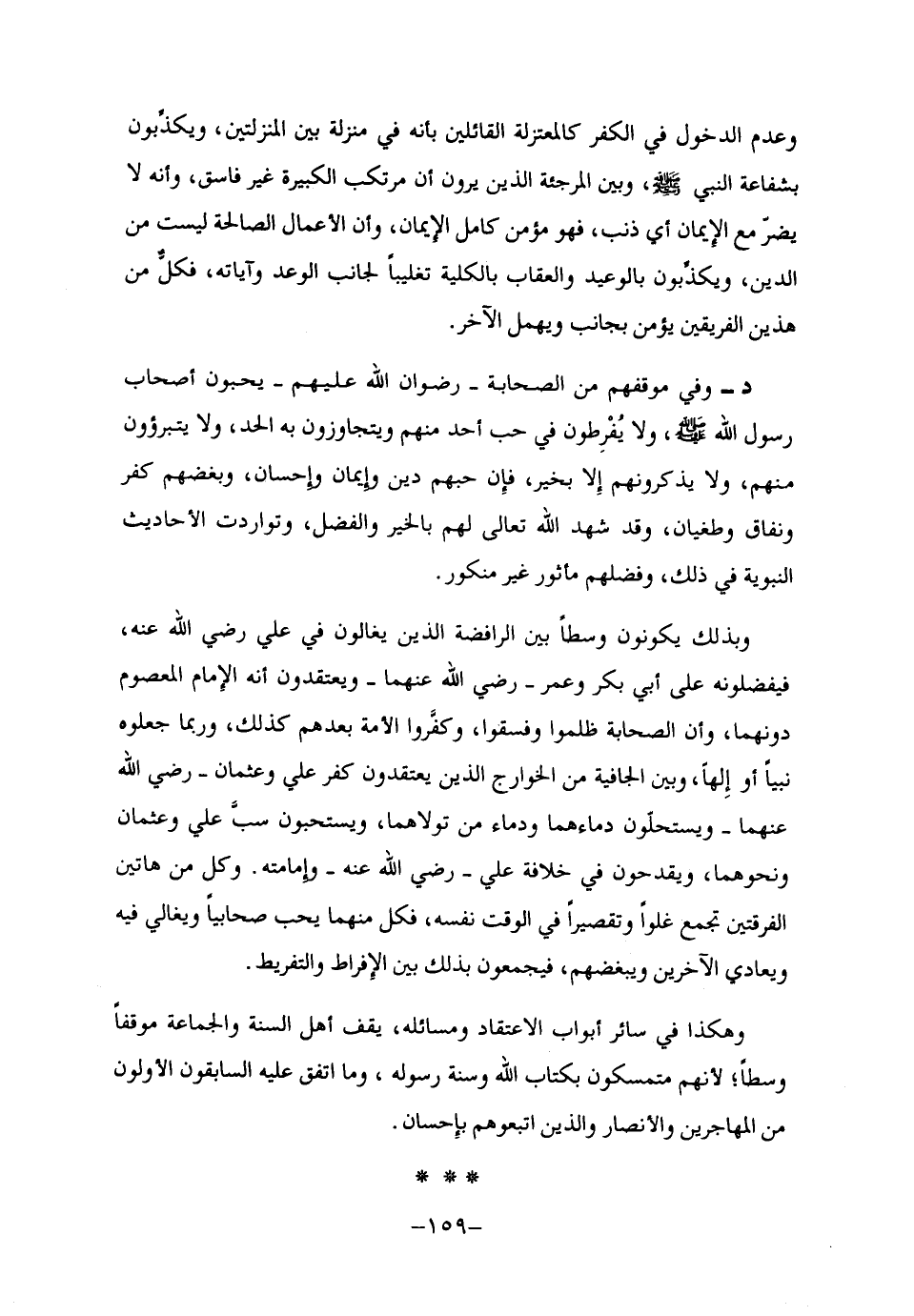 وبذلك يكونون وسطا بين الرافضة الذين يغالون في علي رضي الله عنه، فيفضلونه على أبي بكر وعمر -رضي الله عنهما- ويعتقدون أنه الإمام المعصوم دونهما، وأن الصحابة ظلموا وفسقوا، وكفروا الأمة بعدهم كذلك، وربما جعلوه نبيا أو إلها، وبين الجافية من الخوارج الذين يعتقدون كفر علي وعثمان -رضي الله عنهما- ويستحلون دماءهما ودماء من تولاهما، ويستحبون سب علي وعثمان ونحوهما، ويقدحون في خلافة علي -رضي الله عنه- وإمامته. وكل من هاتين الفرقتين تجمع غلوا وتقصيرا في الوقت نفسه، فكل منهما يحب صحابيا ويغالي فيه ويعادي الآخرين ويبغضهم، فيجمعون بذلك بين الإفراط والتفريط.