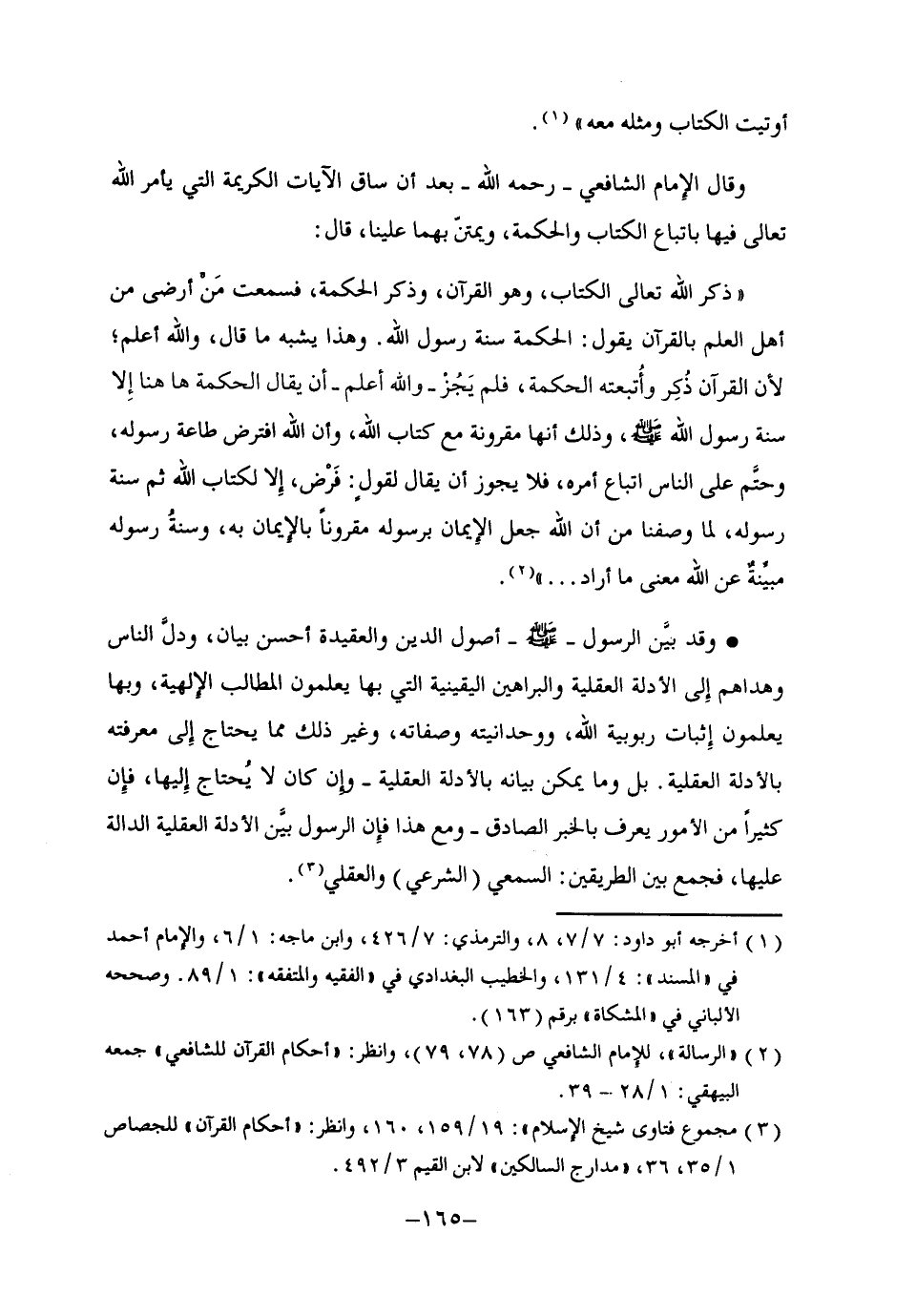 وقال الإمام الشافعي -رحمه الله- بعد أن ساق الآيات الكريمة التي يأمر الله تعالى فيها باتباع الكتاب والحكمة، ويمتن بهما علينا، قال: