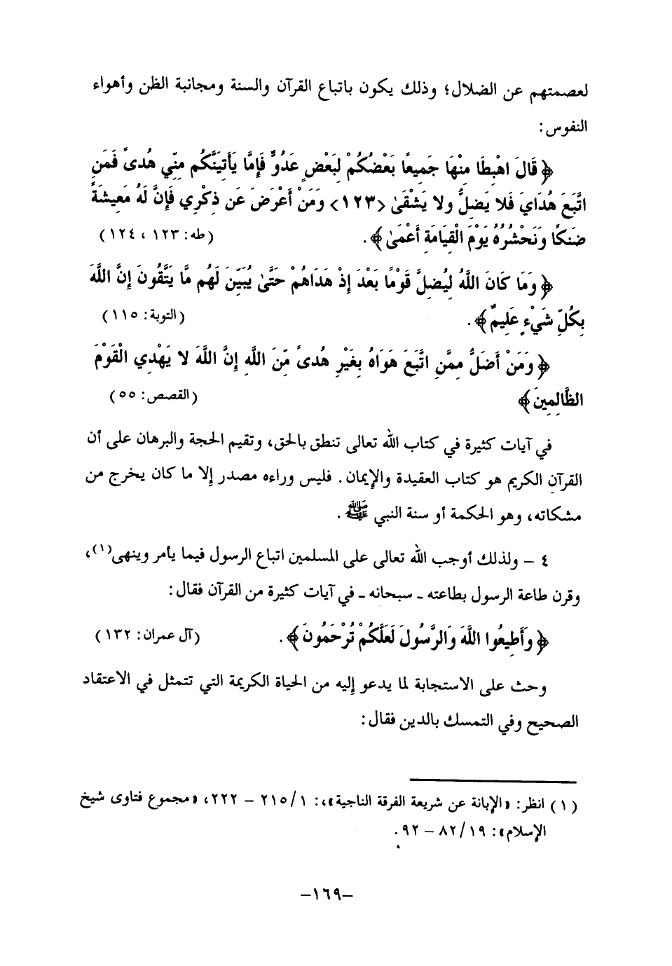 4- ولذلك أوجب الله تعالى على المسلمين اتباع الرسول فيما يأمر وينهى1، وقرن طاعة الرسول بطاعته -سبحانه- في آيات كثيرة من القرآن, فقال: