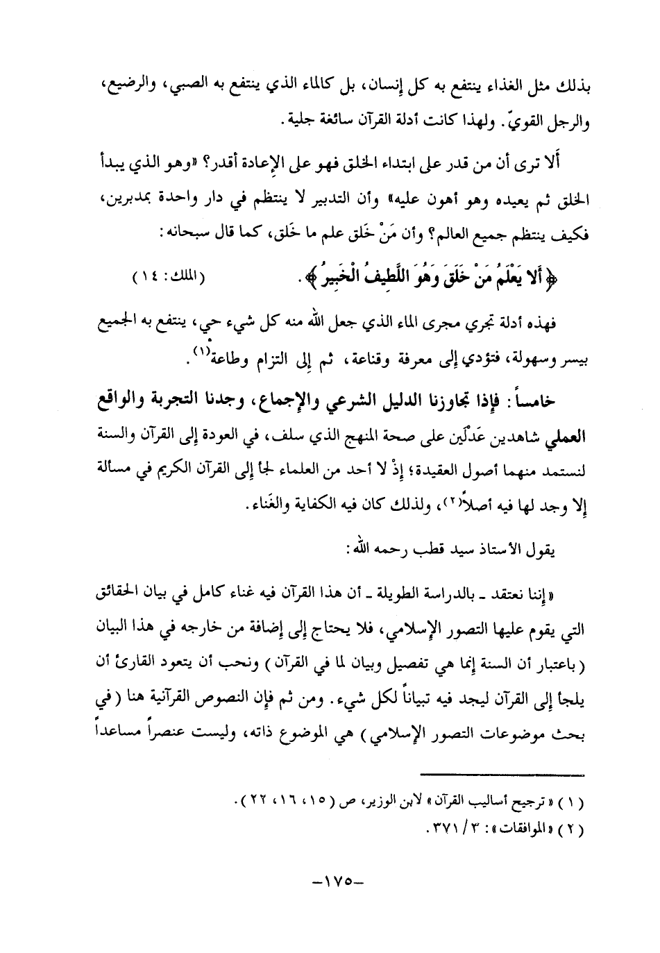 "إننا نعتقد -بالدراسة الطويلة- أن هذا القرآن فيه غناء كامل في بيان الحقائق التي يقوم عليها التصور الإسلامي، فلا يحتاج إلى إضافة من خارجه في هذا البيان "باعتبار أن السنة إنما هي تفصيل وبيان لما في القرآن" ونحب أن يتعود القارئ أن يلجأ إلى القرآن ليجد فيه تبيانا لكل شيء. ومن ثم فإن النصوص القرآنية هنا "في بحث موضوعات التصور الإسلامي" هي الموضوع ذاته، وليست عنصرا مساعدا
