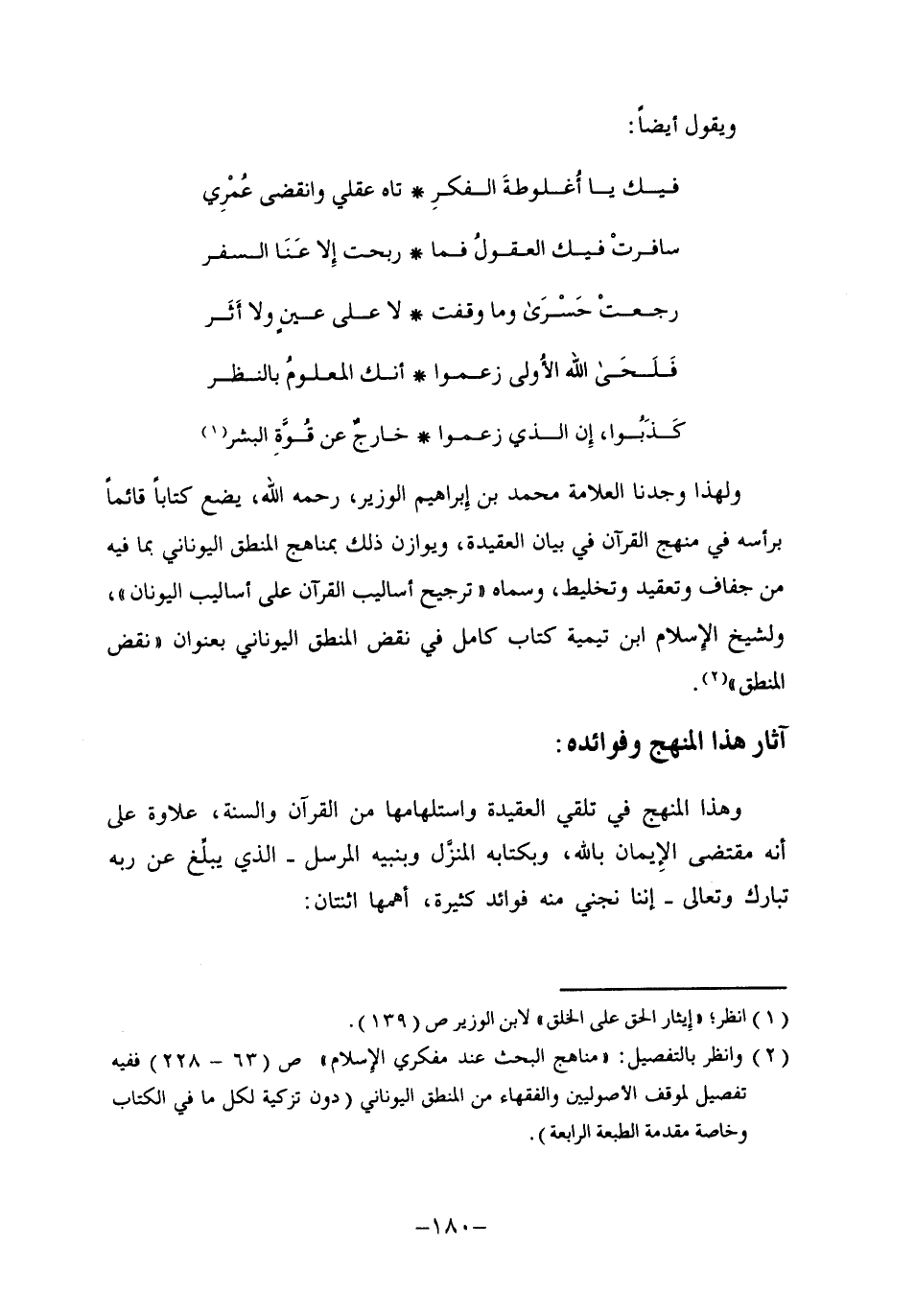 ولهذا وجدنا العلامة محمد بن إبراهيم الوزير -رحمه الله- يضع كتابا قائما برأسه في منهج القرآن في بيان العقيدة، ويوازن ذلك بمناهج المنطق اليوناني بما فيه من جفاف وتعقيد وتخليط، وسماه "ترجيح أساليب القرآن على أساليب اليونان"، ولشيخ الإسلام ابن تيمية كتاب كامل في نقض المنطق اليوناني بعنوان "نقض المنطق"2.