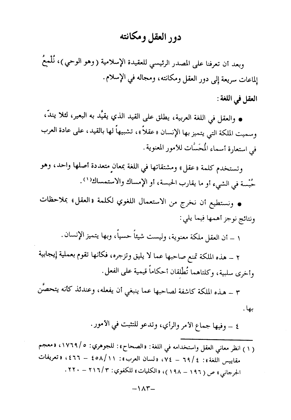 1 انظر معاني العقل واستخدامه في اللغة: "الصحاح" للجوهري: 5/ 1769، "معجم مقاييس اللغة": 4/ 69-74، "لسان العرب": 11/ 458-466، "تعريفات الجرجاني" ص196-198، "الكليات" للكَفَويّ: 3/ 216-220.