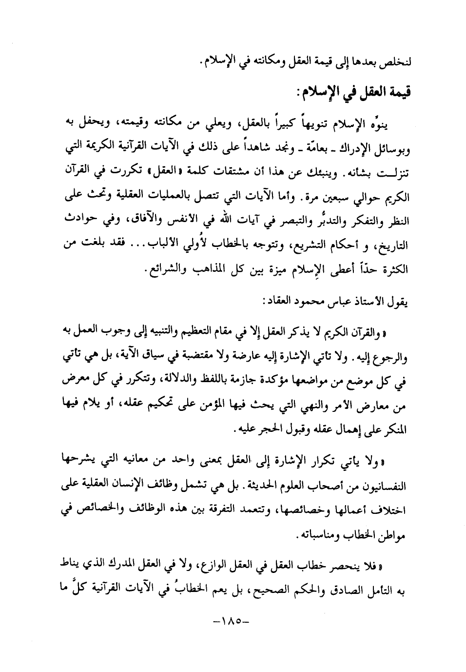 "والقرآن الكريم لا يذكر العقل إلا في مقام التعظيم والتنبيه إلى وجوب العمل به والرجوع إليه. ولا تأتي الإشارة إليه عارضة ولا مقتضبة في سياق الآية، بل هي تأتي في كل موضع من مواضعها مؤكدة جازمة باللفظ والدلالة، وتتكرر في كل معرض من معارض الأمر والنهي التي يحث فيها المؤمن على تحكيم عقله، أو يلام فيها المنكر على إهمال عقله وقبول الحجر عليه".