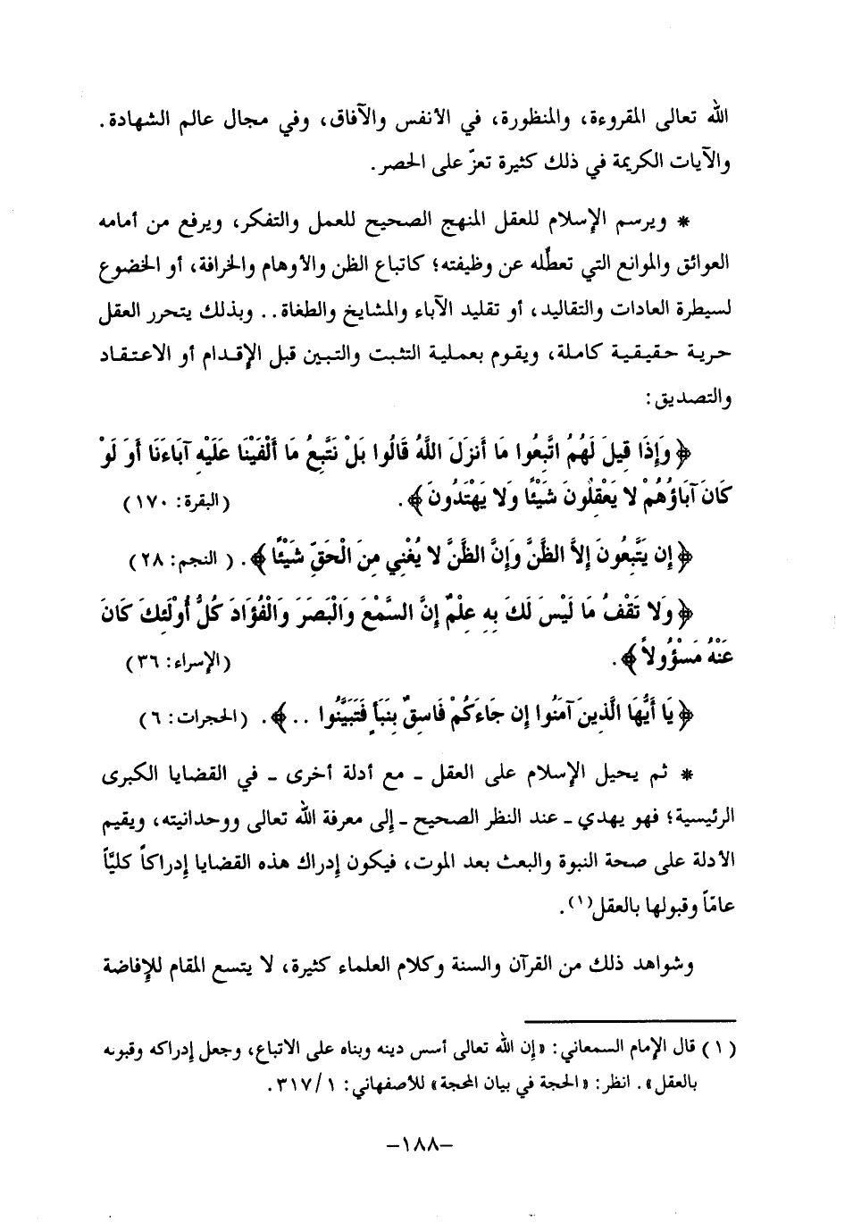 1 قال الإمام السمعاني: "إن الله تعالى أسّس دينه وبناه على الاتباع، وجعل إدراكه وقبوله بالعقل". انظر "الحجة في بيان المحجة" للأصفهاني: 1/ 317.