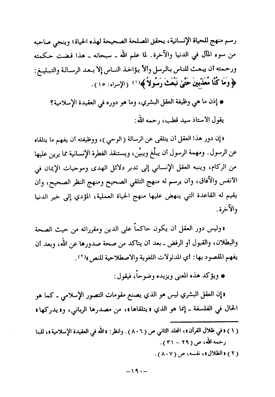 "إن دور هذا العقل أن يتلقى عن الرسالة "الوحي"، ووظيفته أن يفهم ما يتلقاه عن الرسول. ومهمة الرسول أن يبلغ ويبين، ويستنقذ الفطرة الإنسانية مما يرين عليها من الركام، وينبه العقل الإنساني إلى تدبر دلائل الهدى وموجبات الإيمان في الأنفس والآفاق، وأن يرسم له منهج التلقي الصحيح ومنهج النظر الصحيح، وأن يقيم له القاعدة التي ينهض عليها منهج الحياة العملية، المؤدي إلى خير الدنيا والآخرة.