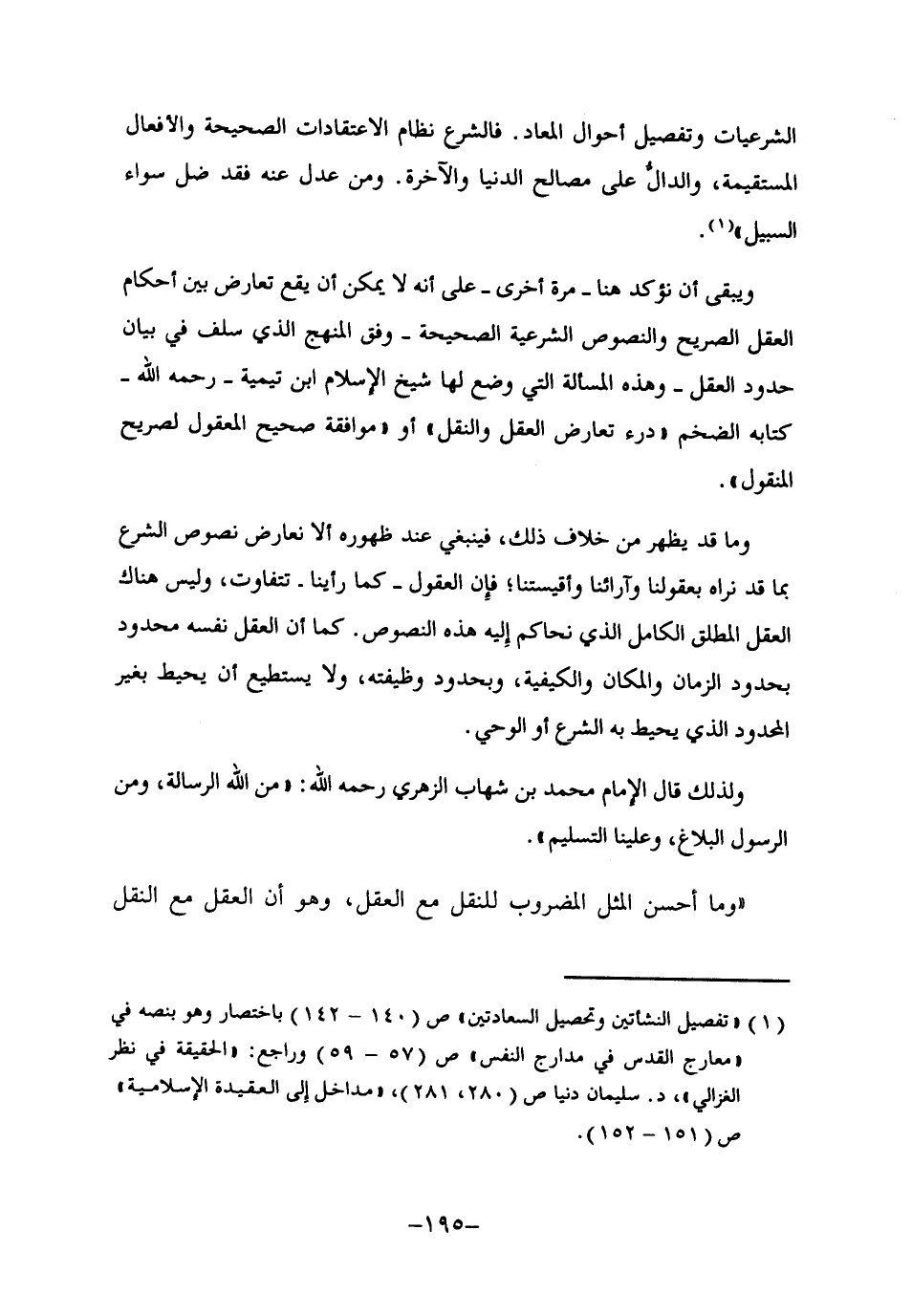 ويبقى أن نؤكد هنا -مرة أخرى- على أنه لا يمكن أن يقع تعارض بين أحكام العقل الصريح والنصوص الشرعية الصحيحة -وفق المنهج الذي سلف في بيان حدود العقل- وهذه المسألة التي وضع لها شيخ الإسلام ابن تيمية -رحمه الله- كتابه الضخم "درء تعارض العقل والنقل" أو "موافقة صحيح المعقول لصريح المنقول".