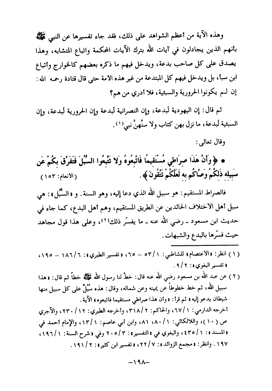 2 عن عبد الله بن مسعود -رضي الله عنه- قال: خَطَّ لنا رسول الله -صلى الله عليه وسلم- خطا ثم قال: $"هذا سبيل الله"، ثم خط خطوطا عن يمينه وعن شماله، وقال: "هذه سبل, على كل سبيل منها شيطان يدعو إليه" ثم قرأ: {وَأَنَّ هَذَا صِرَاطِي مُسْتَقِيمًا فَاتَّبِعُوهُ} الآية.