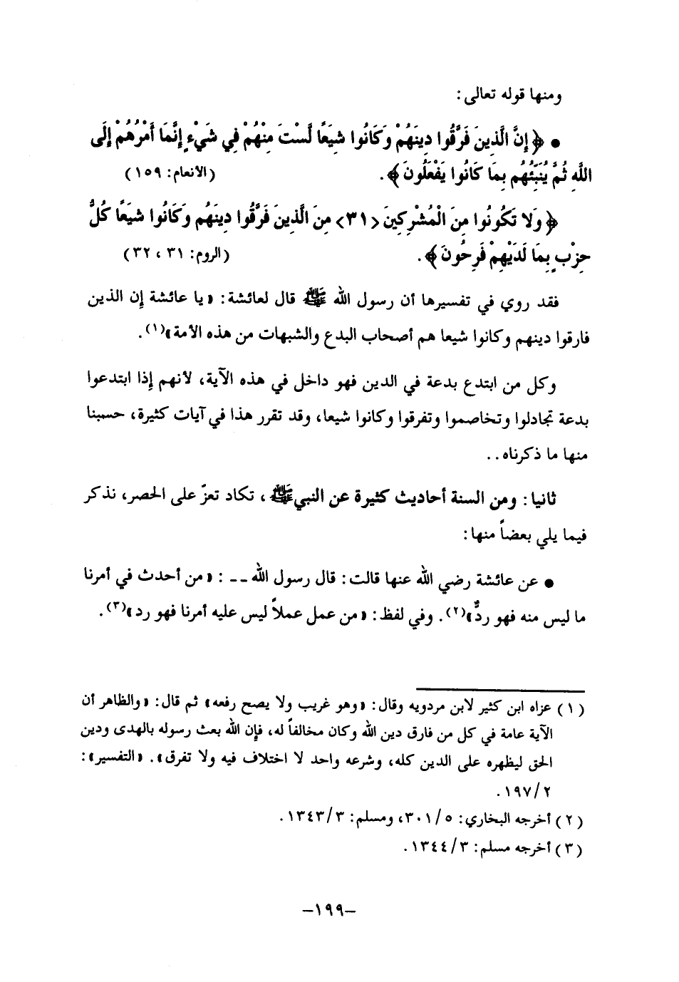عن عائشة -رضي الله عنها- قالت: قال رسول الله: "من أحدث في أمرنا ما ليس منه, فهو ردّ" 2. وفي لفظ: "من عمل عملا ليس عليه أمرنا, فهو رد" 3.