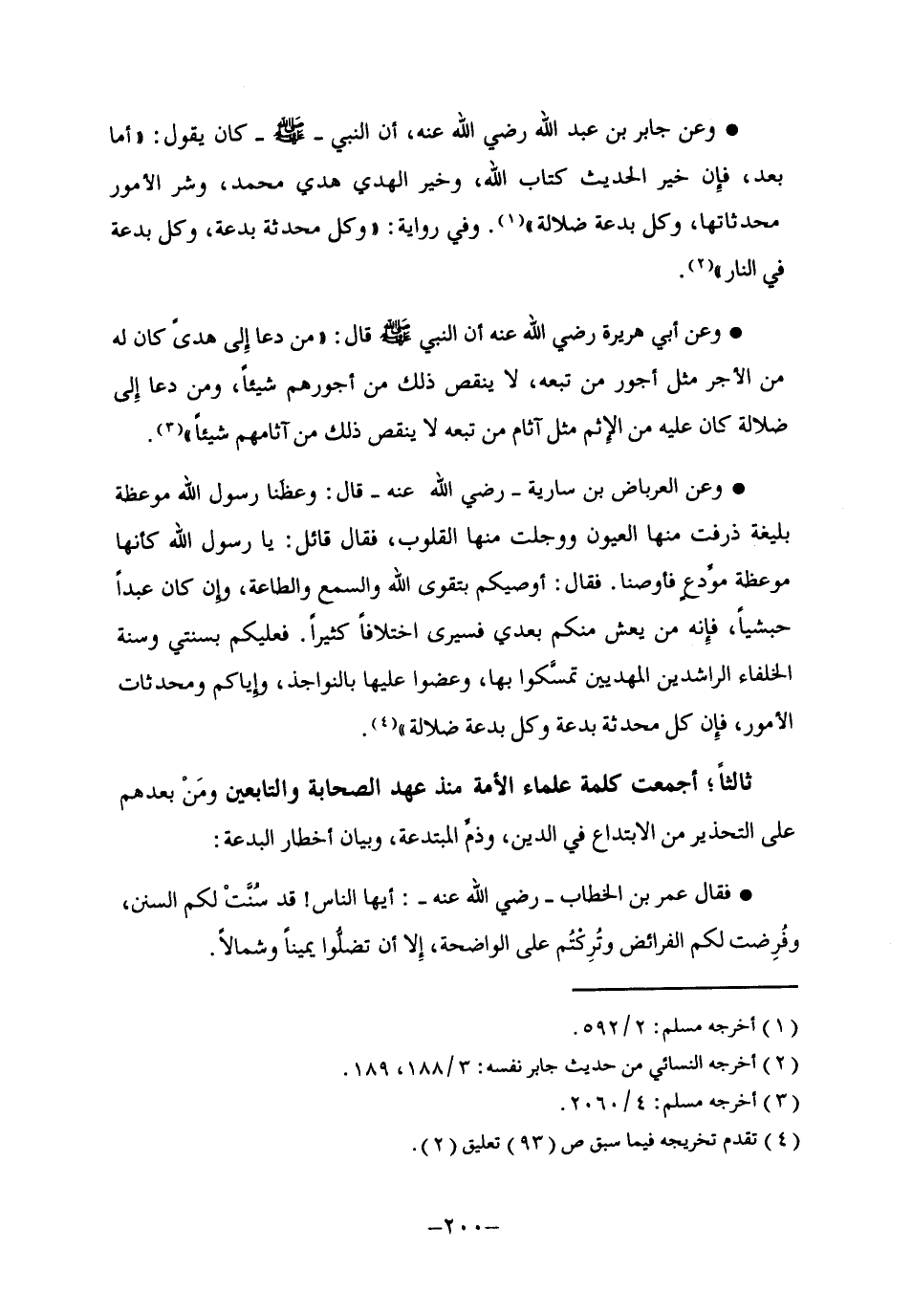 وعن جابر بن عبد الله -رضي الله عنه- أن النبي -صلى الله عليه وسلم- كان يقول: "أما بعد، فإن خير الحديث كتاب الله، وخير الهدي هدي محمد، وشر الأمور محدثاتها، وكل بدعة ضلالة" 1. وفي رواية: "وكل محدثة بدعة، وكل بدعة في النار" 2.
