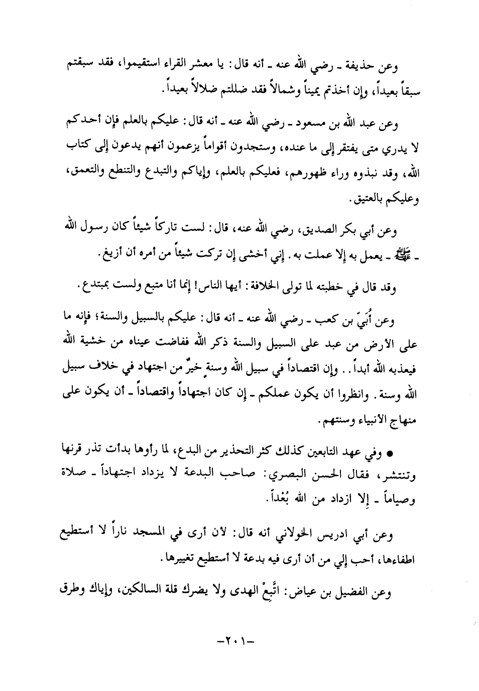 وعن أبي بن كعب -رضي الله عنه- أنه قال: عليكم بالسبيل والسنة؛ فإنه ما على الأرض من عبد على السبيل والسنة ذكر الله ففاضت عيناه من خشية الله فيعذبه الله أبدا ... وإن اقتصادا في سبيل الله وسنة خير من اجتهاد في خلاف سبيل الله وسنة. وانظروا أن يكون عملكم -إن كان اجتهادا واقتصادا- أن يكون على منهاج الأنبياء وسنتهم.