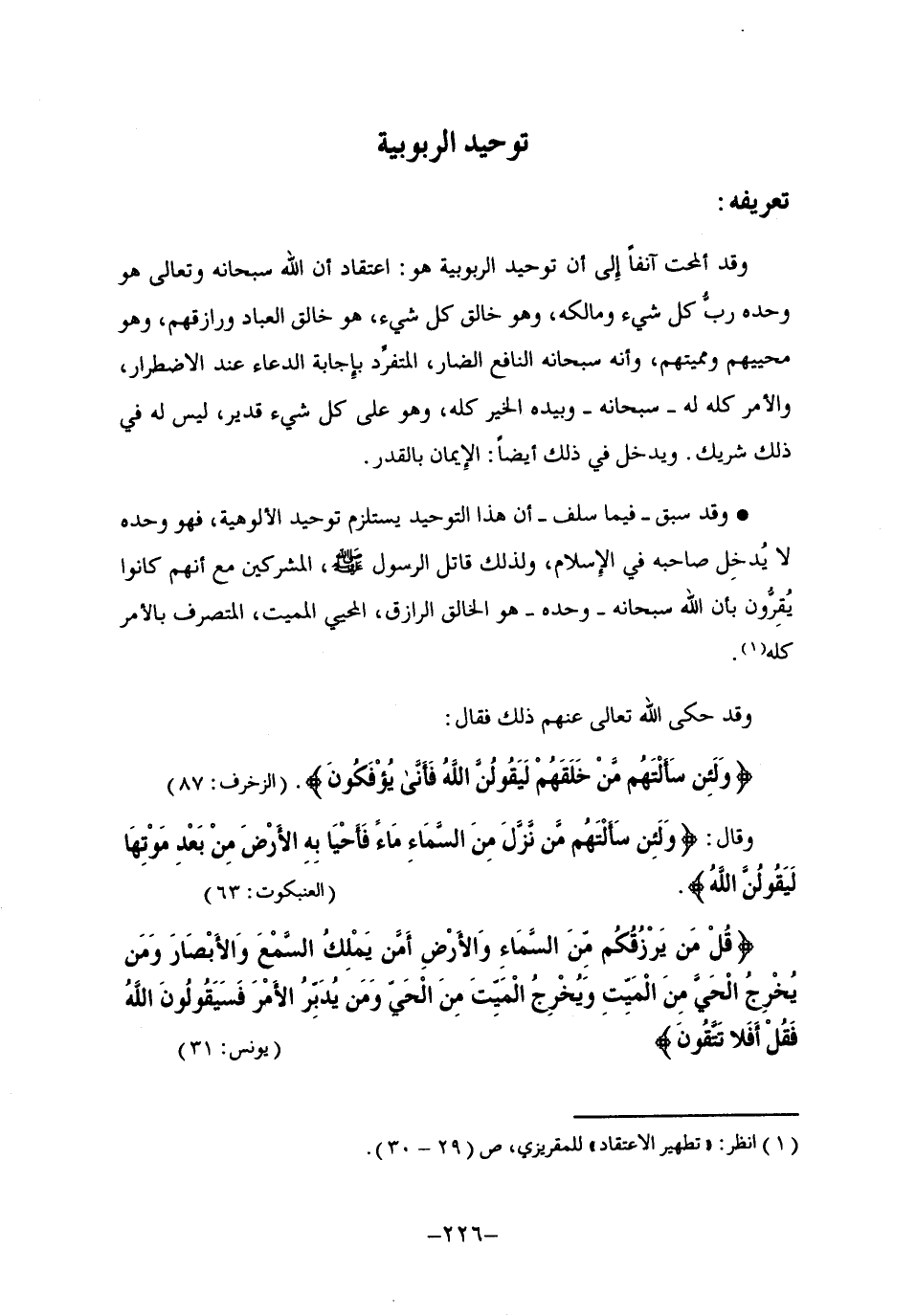 وقد ألمحت آنفا إلى أن توحيد الربوبية هو: اعتقاد أن الله سبحانه وتعالى هو وحده رب كل شيء ومالكه، وهو خالق كل شيء، هو خالق العباد ورازقهم، وهو محييهم ومميتهم، وأنه سبحانه النافع الضار، المتفرد بإجابة الدعاء عند الاضطرار، والأمر كله له -سبحانه- وبيده الخير كله، وهو على كل شيء قدير، ليس له في ذلك شريك, ويدخل في ذلك أيضا: الإيمان بالقدر.