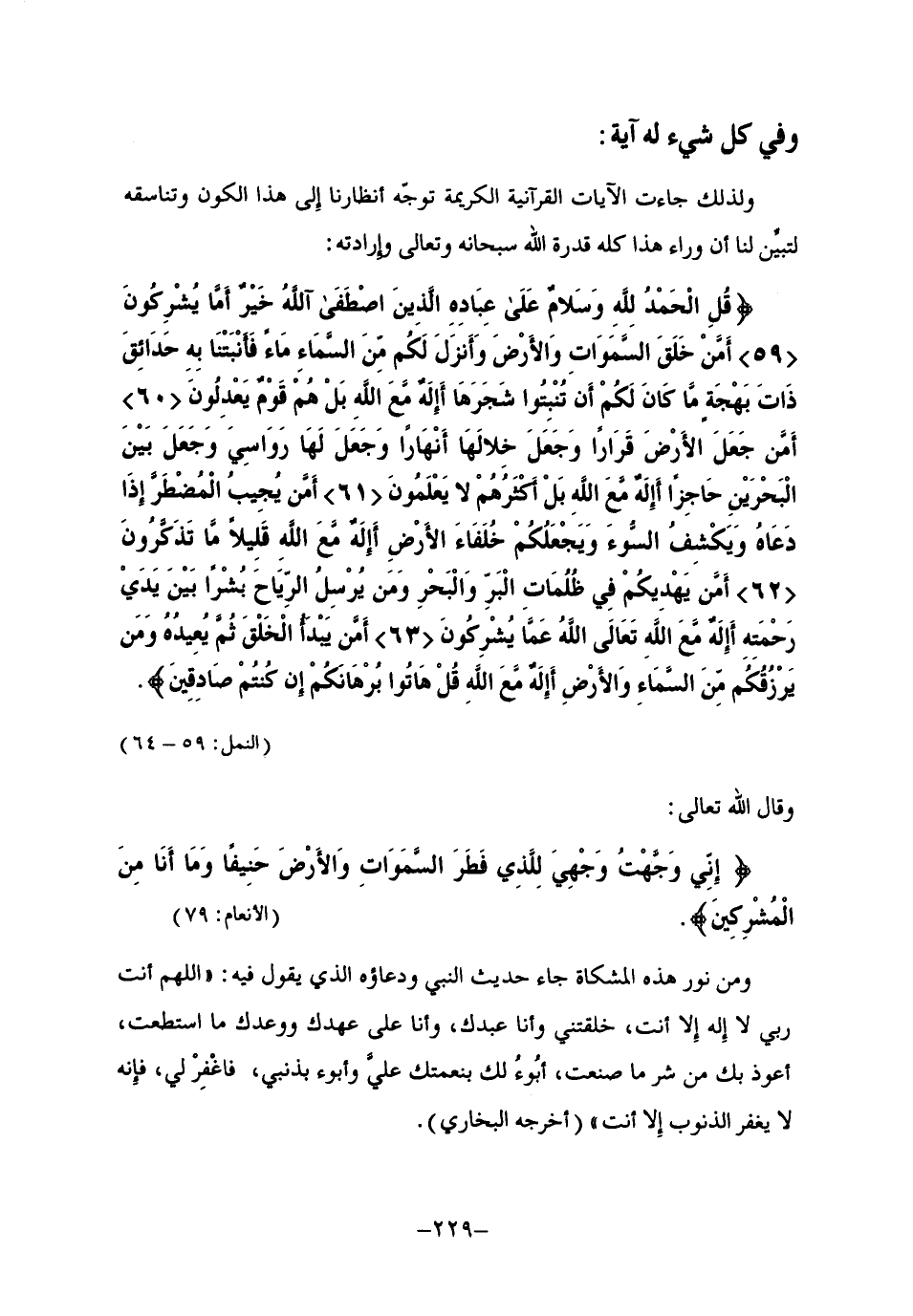 {قُلِ الْحَمْدُ لِلَّهِ وَسَلامٌ عَلَى عِبَادِهِ الَّذِينَ اصْطَفَى آللَّهُ خَيْرٌ أَمَّا يُشْرِكُونَ، أَمَّنْ خَلَقَ السَّمَاوَاتِ وَالْأَرْضَ وَأَنْزَلَ لَكُمْ مِنَ السَّمَاءِ مَاءً فَأَنْبَتْنَا بِهِ حَدَائِقَ ذَاتَ بَهْجَةٍ مَا كَانَ لَكُمْ أَنْ تُنْبِتُوا شَجَرَهَا أَإِلَهٌ مَعَ اللَّهِ بَلْ هُمْ قَوْمٌ يَعْدِلُونَ، أَمَّنْ جَعَلَ الْأَرْضَ قَرَارًا وَجَعَلَ خِلالَهَا أَنْهَارًا وَجَعَلَ لَهَا رَوَاسِيَ وَجَعَلَ بَيْنَ الْبَحْرَيْنِ حَاجِزًا أَإِلَهٌ مَعَ اللَّهِ بَلْ أَكْثَرُهُمْ لا يَعْلَمُونَ، أَمَّنْ يُجِيبُ الْمُضْطَرَّ إِذَا دَعَاهُ وَيَكْشِفُ السُّوءَ وَيَجْعَلُكُمْ خُلَفَاءَ الْأَرْضِ أَإِلَهٌ مَعَ اللَّهِ قَلِيلًا مَا تَذَكَّرُونَ، أَمَّنْ يَهْدِيكُمْ فِي ظُلُمَاتِ الْبَرِّ وَالْبَحْرِ وَمَنْ يُرْسِلُ الرِّيَاحَ بُشْرًا بَيْنَ يَدَيْ رَحْمَتِهِ أَإِلَهٌ مَعَ اللَّهِ تَعَالَى اللَّهُ عَمَّا يُشْرِكُونَ، أَمَّنْ يَبْدأُ الْخَلْقَ ثُمَّ يُعِيدُهُ وَمَنْ يَرْزُقُكُمْ مِنَ السَّمَاءِ وَالْأَرْضِ أَإِلَهٌ مَعَ اللَّهِ قُلْ هَاتُوا بُرْهَانَكُمْ إِنْ كُنْتُمْ صَادِقِينَ} [النمل 59-64] .