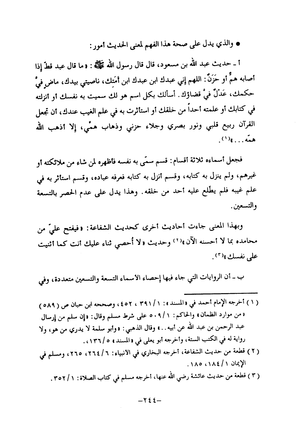 فجعل أسماءه ثلاثة أقسام: قسم سمى به نفسه فأظهره لمن شاء من ملائكته أو غيرهم، ولم ينزل به كتابه، وقسم أنزل به كتابه فعرفه عباده، وقسم استأثر به في علم غيبه, فلم يطلع عليه أحد من خلقه. وهذا يدل على عدم الحصر بالتسعة والتسعين.