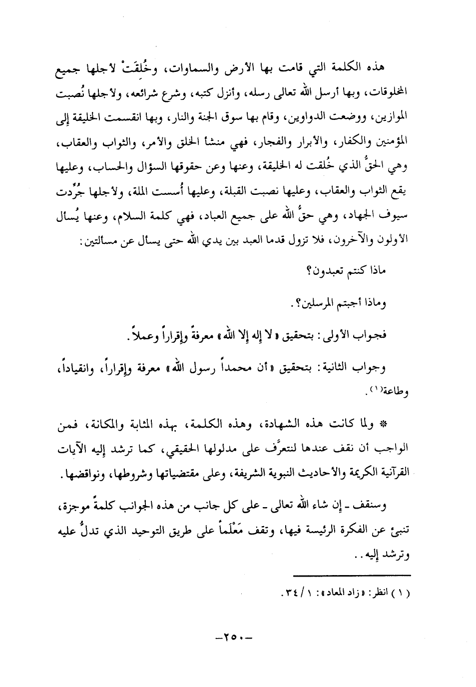 هذه الكلمة التي قامت بها الأرض والسموات، وخُلقت لأجلها جميع المخلوقات، وبها أرسل الله تعالى رسله، وأنزل كتبه، وشرع شرائعه، ولأجلها نُصبت الموازين، ووضعت الدواوين، وقام بها سوق الجنة والنار، وبها انقسمت الخليقة إلى المؤمنين والكفار، والأبرار والفجار، فهي منشأ الخلق والأمر، والثواب والعقاب، وهي الحق الذي خُلقت له الخليقة، وعنها وعن حقوقها السؤال والحساب، وعليها يقع الثواب والعقاب، وعليها نصبت القبلة، وعليها أسست الملة، ولأجلها جردت سيوف الجهاد، وهي حق الله على جميع العباد، فهي كلمة السلام، وعنها يُسأل الأولون والآخرون، فلا تزول قدما العبد بين يدي الله حتى يسأل عن مسألتين: