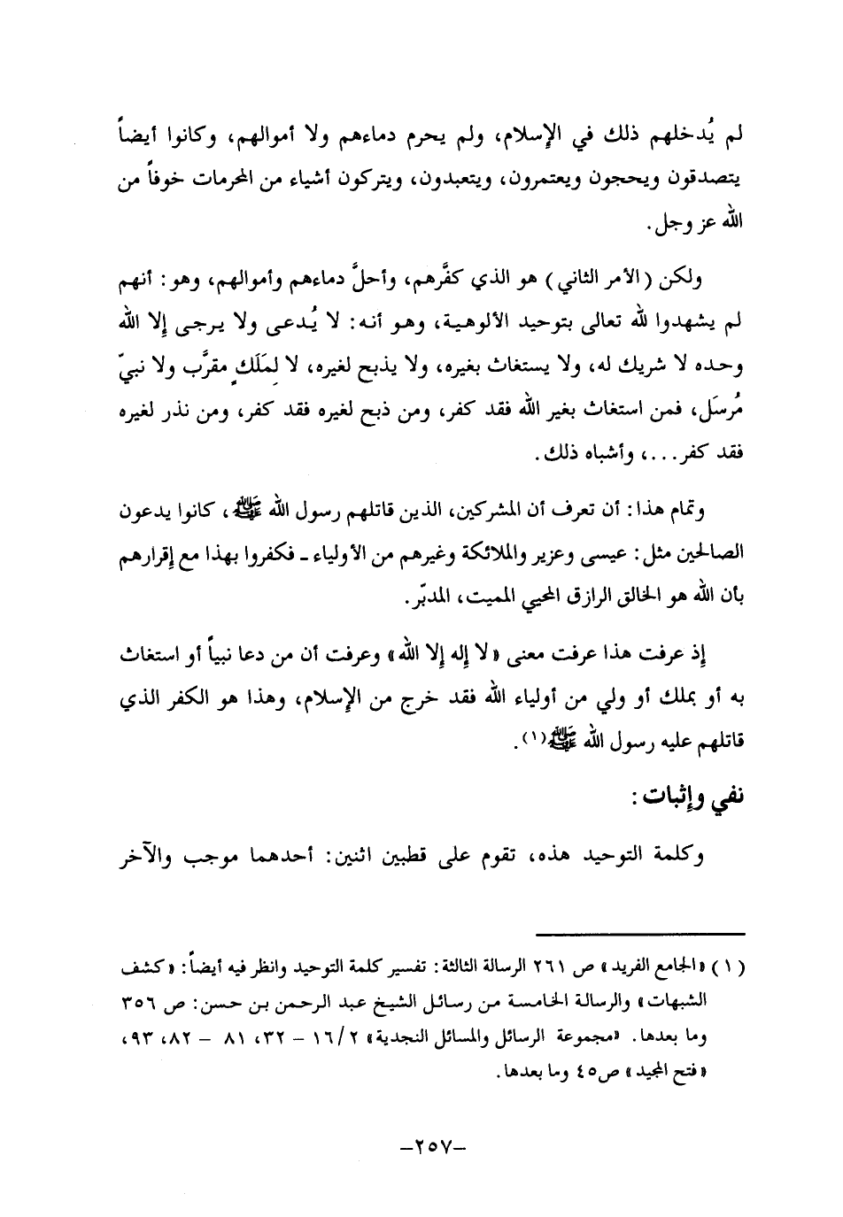 1 "الجامع الفريد" ص261 الرسالة الثالثة, تفسير كلمة التوحيد, وانظر فيه أيضا: "كشف الشبهات" والرسالة الخامسة من رسائل الشيخ عبد الرحمن بن حسن: ص356 وما بعدها. "مجموعة الرسائل والمسائل النجدية" 2/ 16-32، 81-82، 93، "فتح المجيد" ص45 وما بعدها.