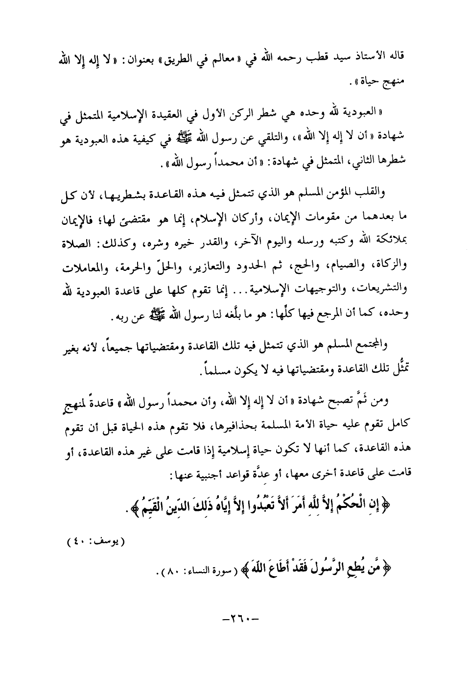 ومن ثم تصبح شهادة "أن لا إله إلا الله، وأن محمدا رسول الله" قاعدة لمنهج كامل تقوم عليه حياة الأمة المسلمة بحذافيرها، فلا تقوم هذه الحياة قبل أن تقوم هذه القاعدة، كما أنها لا تكون حياة إسلامية إذا قامت على غير هذه القاعدة، أو قامت على قاعدة أخرى معها، أو عدة قواعد أجنبية عنها:
