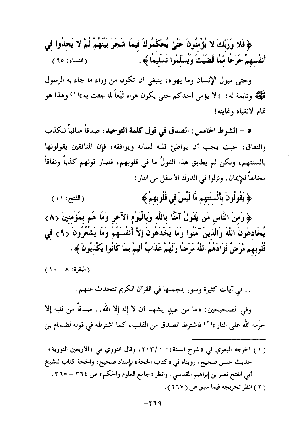 وفي الصحيحين: "ما من عبد يشهد أن لا إله إلا الله.. صدقا من قلبه, إلا حرمه الله على النار"2 فاشترط الصدق من القلب، كما اشترطه في قوله لضمام بن