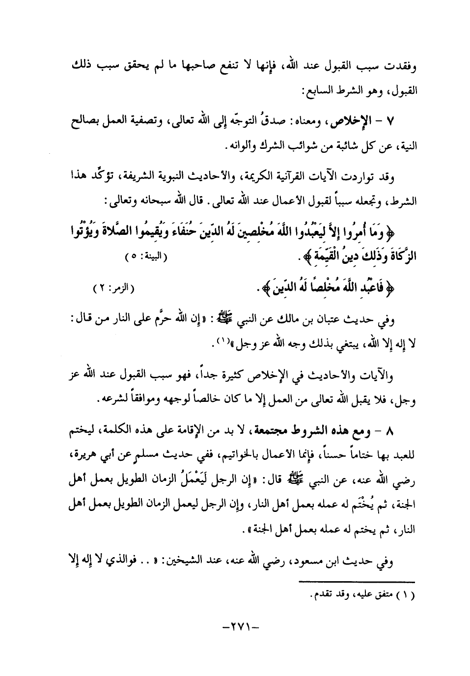 وقد تواردت الآيات القرآنية الكريمة، والأحاديث النبوية الشريفة، تؤكد هذا الشرط، وتجعله سببا لقبول الأعمال عند الله تعالى. قال الله سبحانه وتعالى: