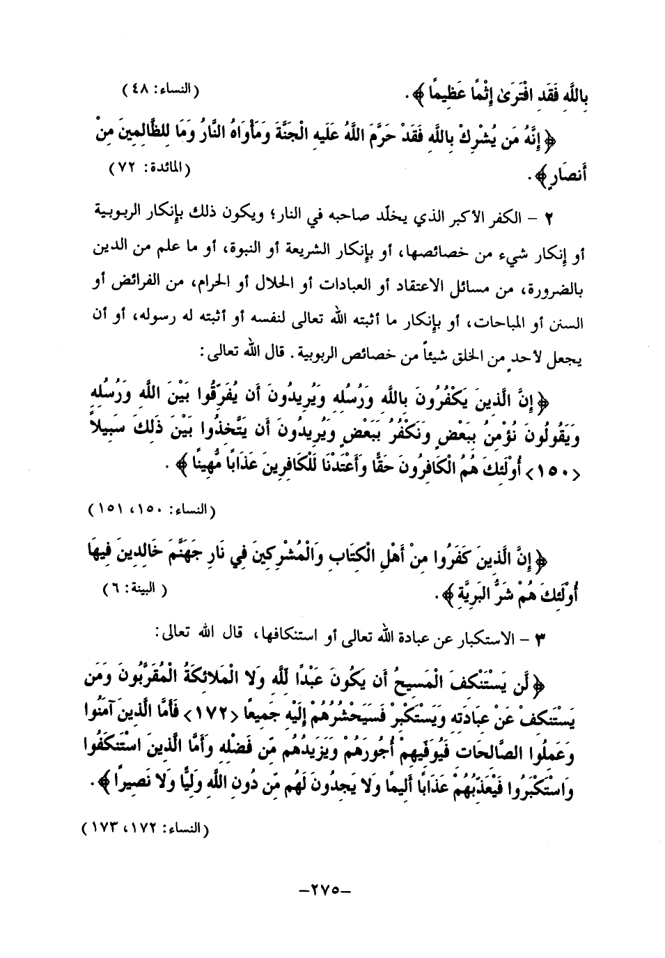 2- الكفر الأكبر الذي يخلّد صاحبه في النار؛ ويكون ذلك بإنكار الربوبية أو إنكار شيء من خصائصها، أو بإنكار الشريعة أو النبوة، أو ما علم من الدين بالضرورة، من مسائل الاعتقاد أو العبادات أو الحلال أو الحرام، من الفرائض أو السنن أو المباحات، أو بإنكار ما أثبته الله تعالى لنفسه أو أثبته له رسوله، أو أن يجعل لأحد من الخلق شيئا من خصائص الربوبية. قال الله تعالى: