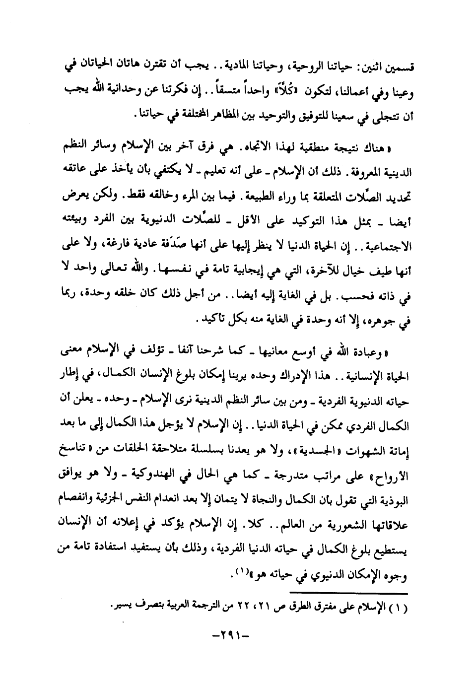قسمين اثنين: حياتنا الروحية، وحياتنا المادية ... يجب أن تقترن هاتان الحياتان في وعينا وفي أعمالنا، لتكون "كلا" واحدا متسقا.. إن فكرتنا عن وحدانية الله يجب أن تتجلى في سعينا للتوفيق والتوحيد بين المظاهر المختلفة في حياتنا".