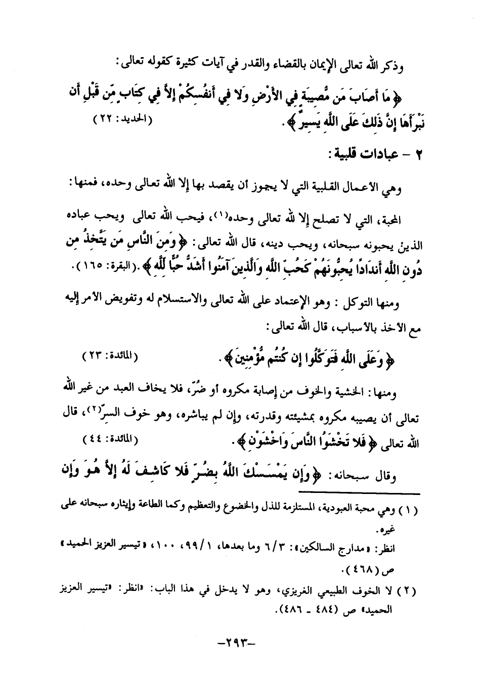 ومنها: الخشية والخوف من إصابة مكروه أو ضُرّ، فلا يخاف العبد من غير الله تعالى أن يصيبه مكروه بمشيئته وقدرته، وإن لم يباشره، وهو خوف السر2، قال الله تعالى: {فَلا تَخْشَوُا النَّاسَ وَاخْشَوْنِ} [المائدة: 44] .