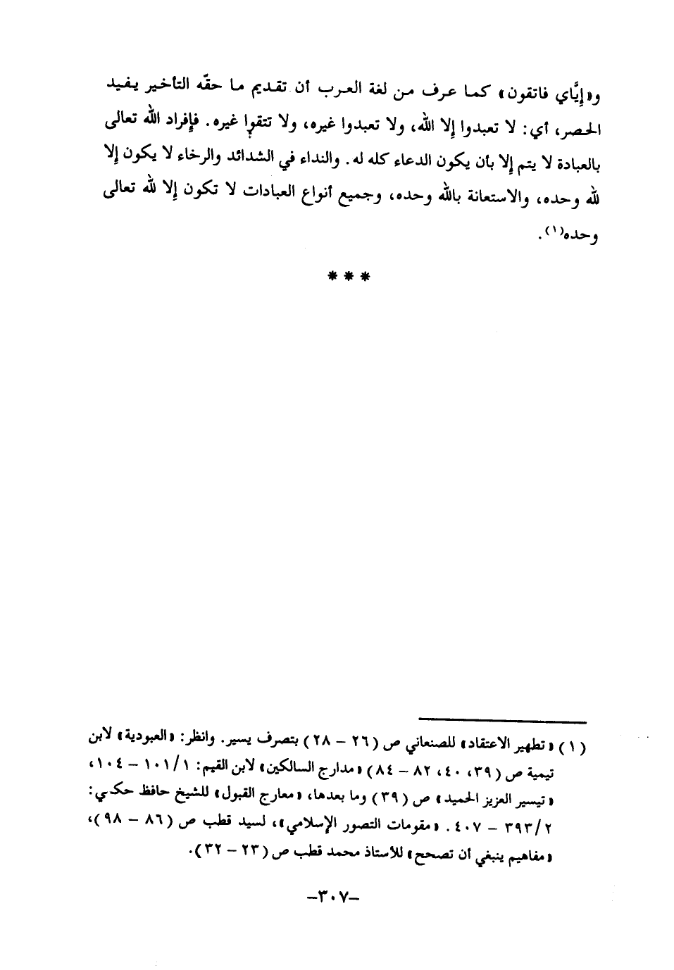 1 "تطهير الاعتقاد" للصنعاني ص26-28 بتصرف يسير. وانظر: "العبودية" لابن تيمية ص39، 40، 82-84, "مدارج السالكين" لابن القيم: 1/ 101-104، "تيسير العزيز الحميد" ص39 وما بعدها، "معارج القبول" للشيخ حافظ حكمي: 2/ 393-407, "مقومات التصور الإسلامي"، لسيد قطب ص86-98، "مفاهيم ينبغي أن تصحح" للأستاذ محمد قطب ص23-32.