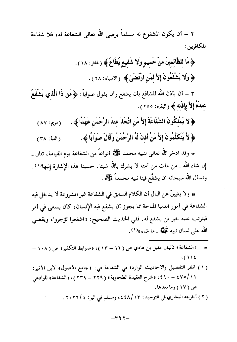 1 انظر التفصيل والأحاديث الواردة في الشفاعة في: "جامع الأصول" لابن الأثير: 11/ 475-490، "شرح العقيدة الطحاوية" "229-239"، "الشفاعة" للوادعي ص17 وما بعدها.