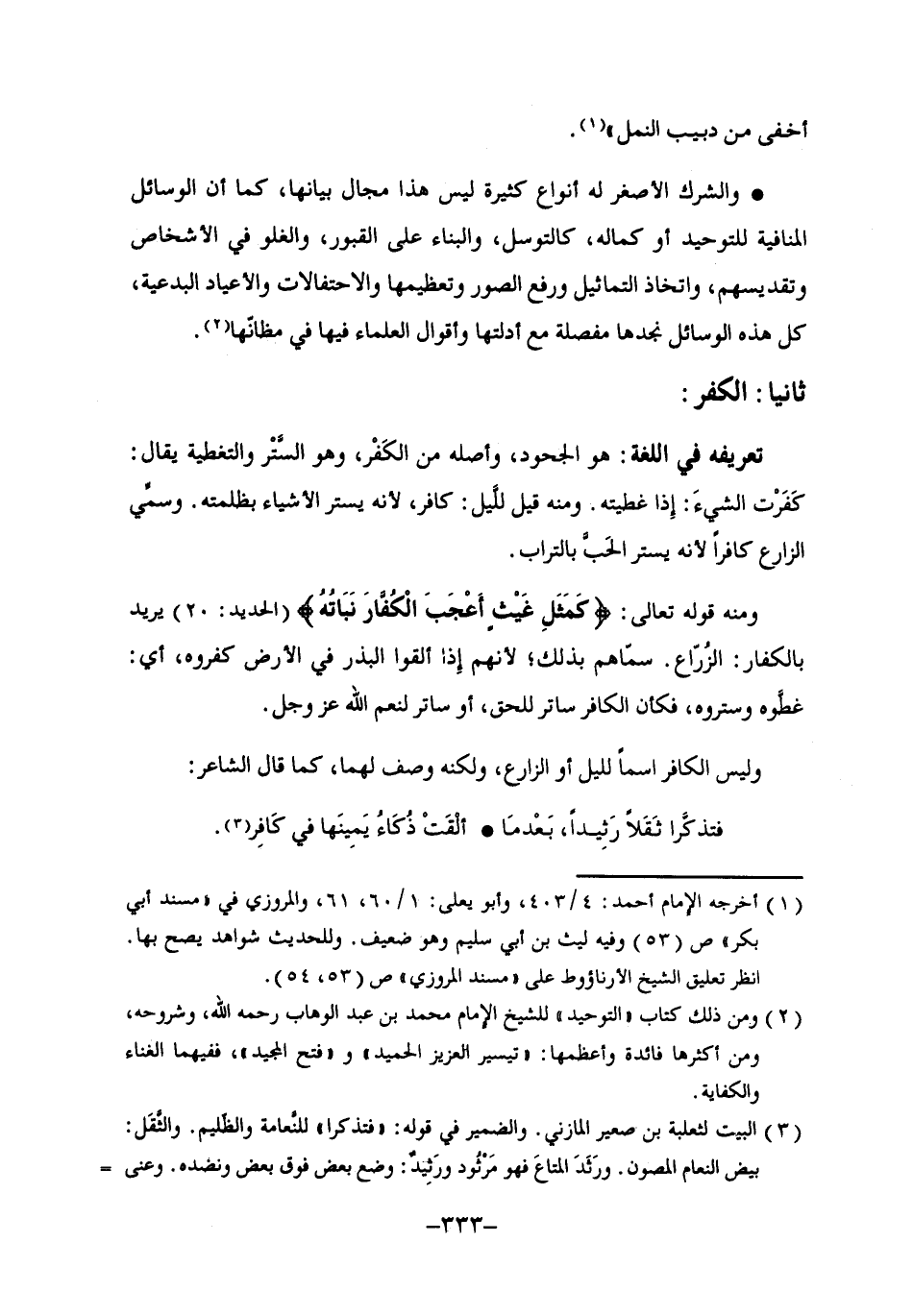 ومنه قوله تعالى: {كَمَثَلِ غَيْثٍ أَعْجَبَ الْكُفَّارَ نَبَاتُهُ} [الحديد: 20] يريد بالكفار: الزراع. سماهم بذلك؛ لأنهم إذا ألقوا البذر في الأرض كفروه، أي: غطوه وستروه، فكأن الكافر ساتر للحق، أو ساتر لنعم الله عز وجل.