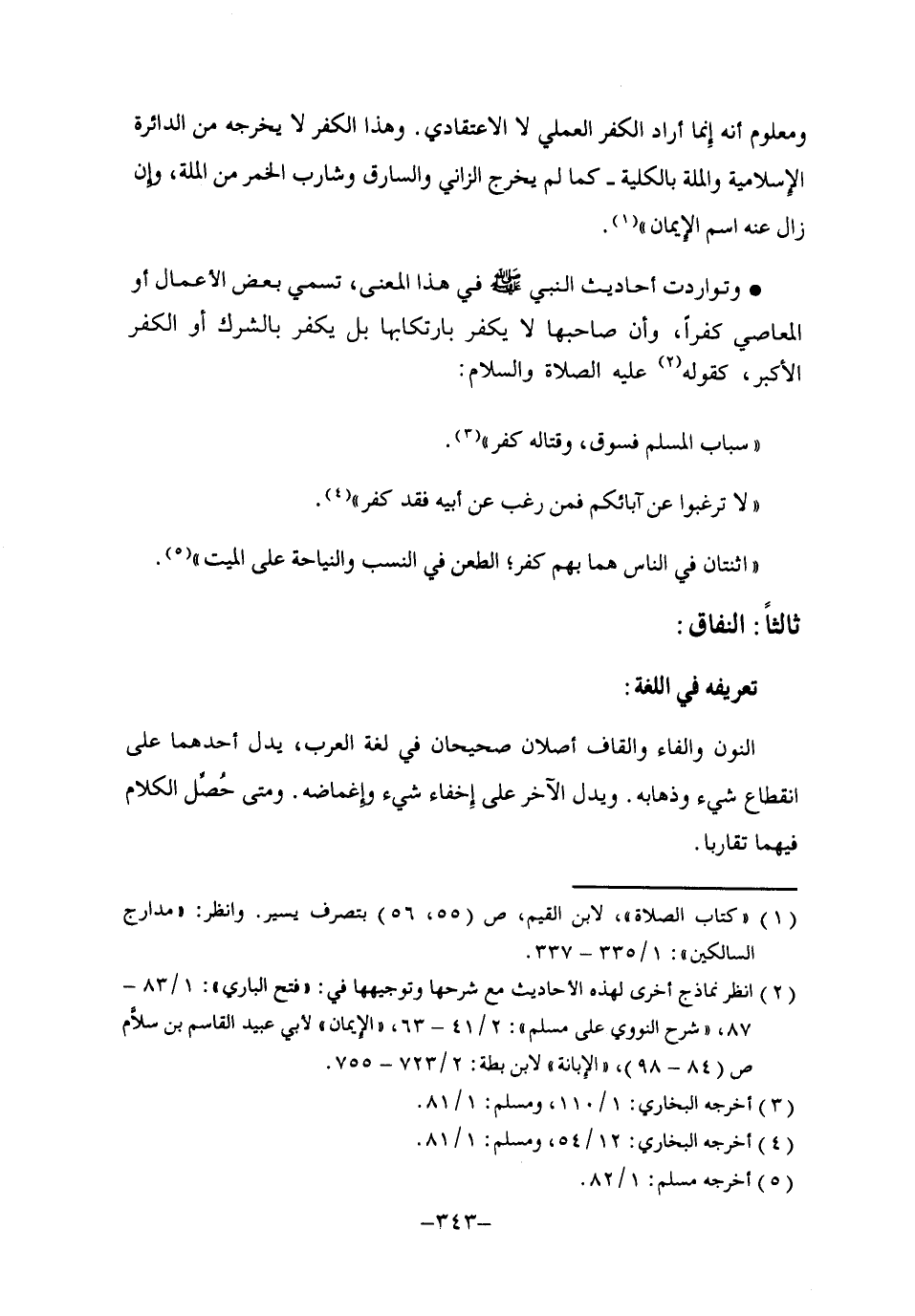 وتواردت أحاديث النبي -صلى الله عليه وسلم- في هذا المعنى، تسمي بعض الأعمال أو المعاصي كفرا، وأن صاحبها لا يكفر بارتكابها, بل يكفر بالشرك أو الكفر الأكبر، كقوله2 عليه الصلاة والسلام: