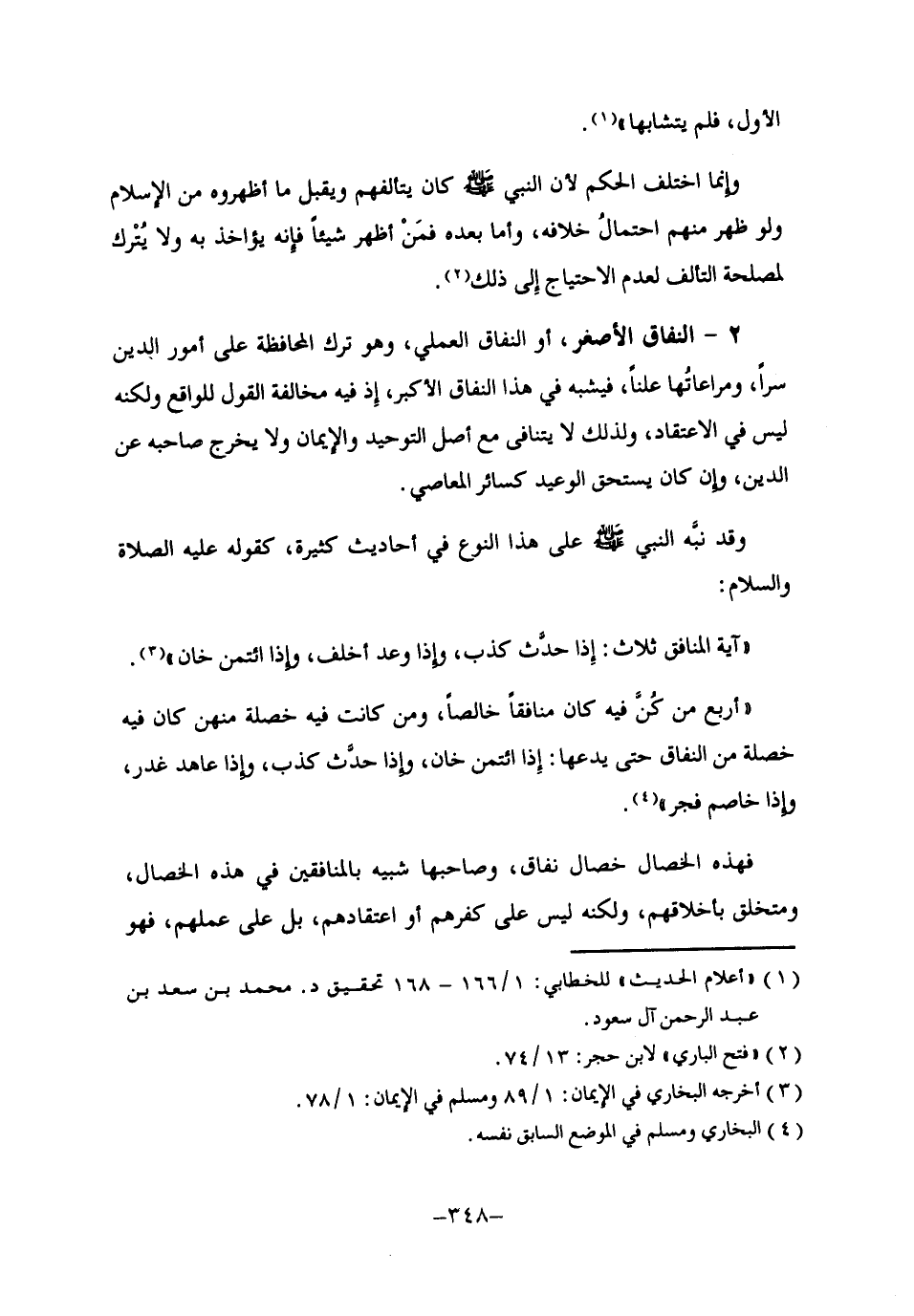 فهذه الخصال خصال نفاق، وصاحبها شبيه بالمنافقين في هذه الخصال ومتخلق بأخلاقهم، ولكنه ليس على كفرهم أو اعتقادهم، بل على عملهم، فهو