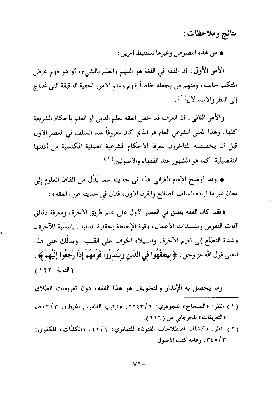 "فقد كان الفقه يطلق في العصر الأول على علم طريق الآخرة، ومعرفة دقائق آفات النفوس ومفسدات الأعمال، وقوة الإحاطة بحقارة الدنيا -بالنسبة للآخرة- وشدة التطلع إلى نعيم الآخرة, واستيلاء الخوف على القلب. ويدلك على هذا المعنى قول الله عز وجل: {لِيَتَفَقَّهُوا فِي الدِّينِ وَلِيُنْذِرُوا قَوْمَهُمْ إِذَا رَجَعُوا إِلَيْهِمْ} [التوبة: 122] .