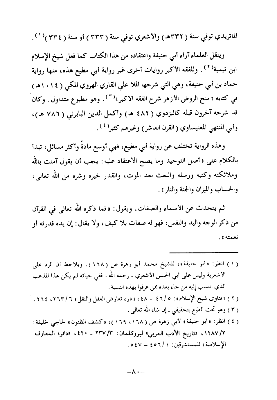 1 انظر: "أبو حنيفة"، للشيخ محمد أبي زهرة ص168. ويلاحظ أن الرد على الأشعرية وليس على أبي الحسن الأشعري رحمه الله, ففي حياته لم يكن هذا المذهب الذي انتسب إليه من جاء بعده ممن عرفوا بهذه النسبة.