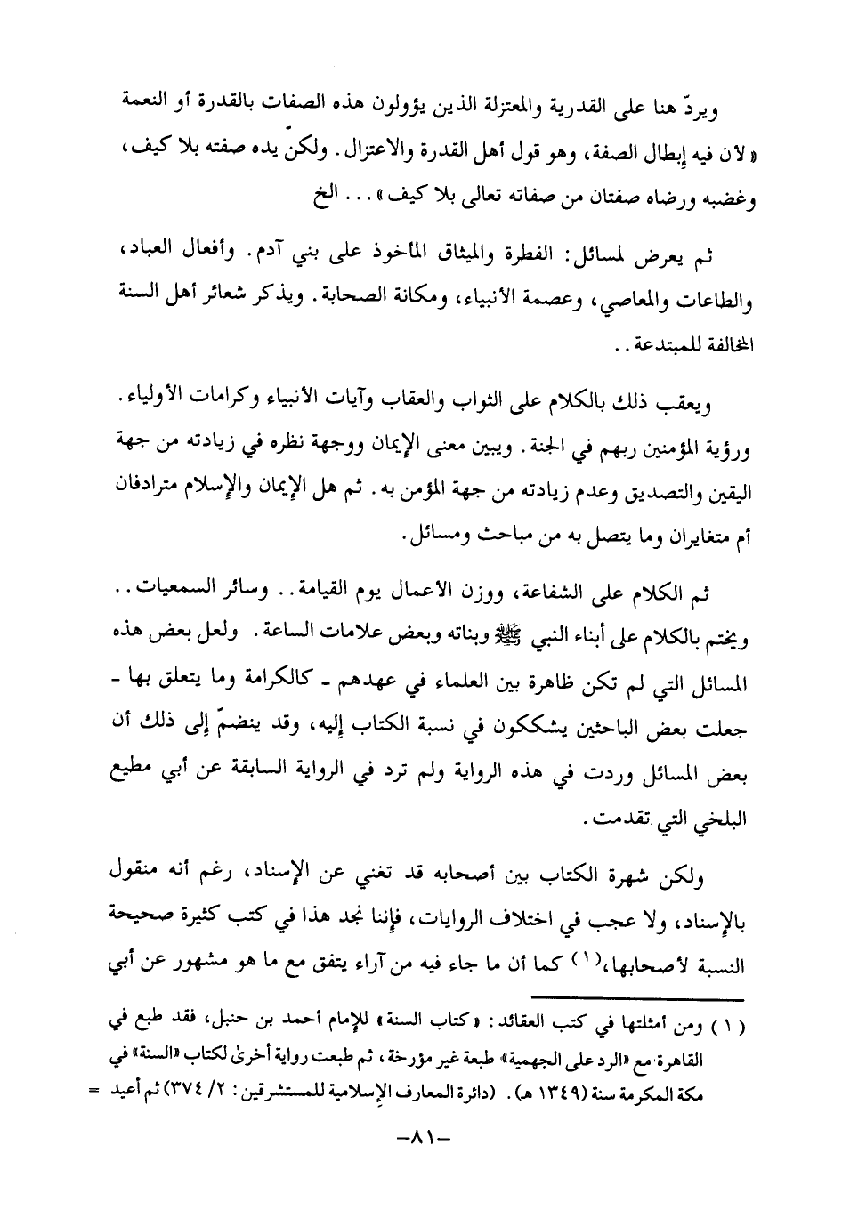 ثم الكلام على الشفاعة، ووزن الأعمال يوم القيامة.. وسائر السمعيات.. ويختم بالكلام على أبناء النبي -صلى الله عليه وسلم- وبناته وبعض علامات الساعة. ولعل بعض هذه المسائل التي لم تكن ظاهرة بين العلماء في عهدهم -كالكرامة وما يتعلق بها- جعلت بعض الباحثين يشككون في نسبة الكتاب إليه، وقد ينضم إلى ذلك أن بعض المسائل وردت في هذه الرواية, ولم ترد في الرواية السابقة عن أبي مطيع البلخي التي تقدمت.