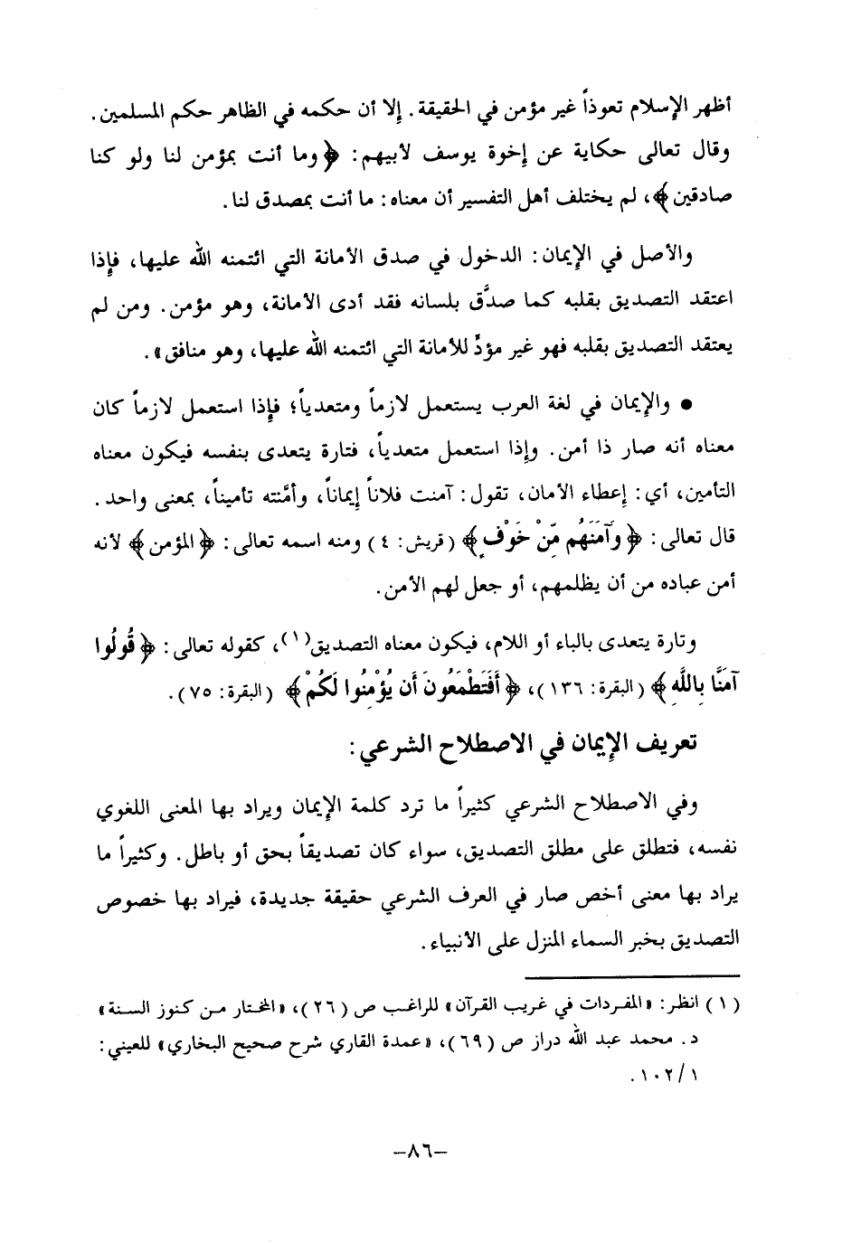 وتارة يتعدى بالباء أو اللام، فيكون معناه التصديق1، كقوله تعالى: {قُولُوا آمَنَّا بِاللَّهِ} [البقرة: 136] ، {أَفَتَطْمَعُونَ أَنْ يُؤْمِنُوا لَكُمْ} [البقرة: 75] .