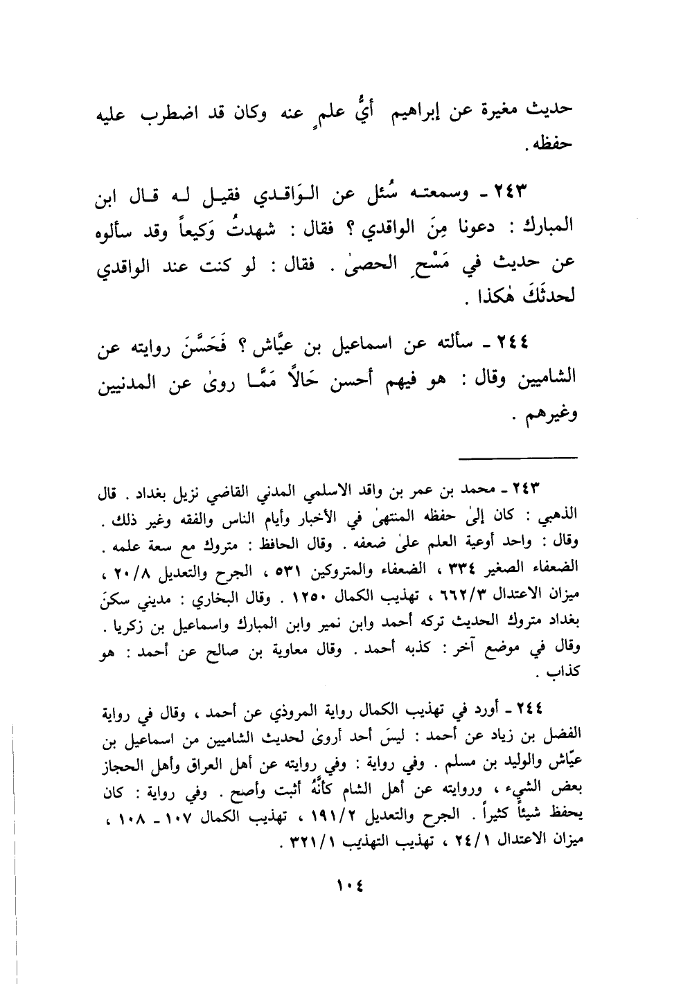 243 - وسمعته سُئِلَ عَن الْوَاقِدِيّ فَقيل لَهُ قَالَ ابْن الْمُبَارك دَعونَا من الْوَاقِدِيّ فَقَالَ شهِدت وكيعا وَقد سَأَلُوهُ عَن حَدِيث فِي مسح الْحَصَى فَقَالَ لَو كنت عِنْد الْوَاقِدِيّ لحدثك هَكَذَا