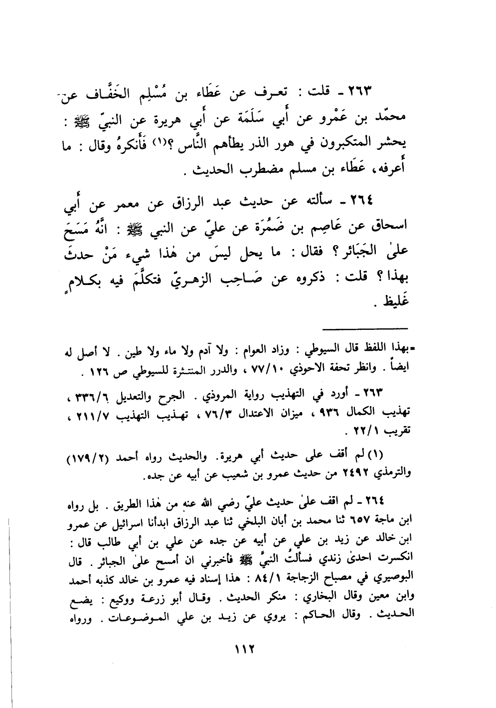 263 - قُلْتُ تَعْرِفُ عَنْ عَطَاءِ بْنِ مُسْلِمٍ الْخَفَّافِ عَنْ مُحَمَّدِ بْنِ عَمْرٍو عَنْ أَبِي سَلَمَةَ عَنْ أَبِي هُرَيْرَةَ عَنِ النَّبِيِّ صَلَّى اللَّهُ عَلَيْهِ وَسلم يحْشر المتكبرون فِي هور الذَّر يطأهم النَّاسُ فَأَنْكَرَهُ وَقَالَ مَا أَعْرِفُهُ عَطَاءُ بْنُ مُسْلِمٍ مُضْطَرِبُ الْحَدِيثِ