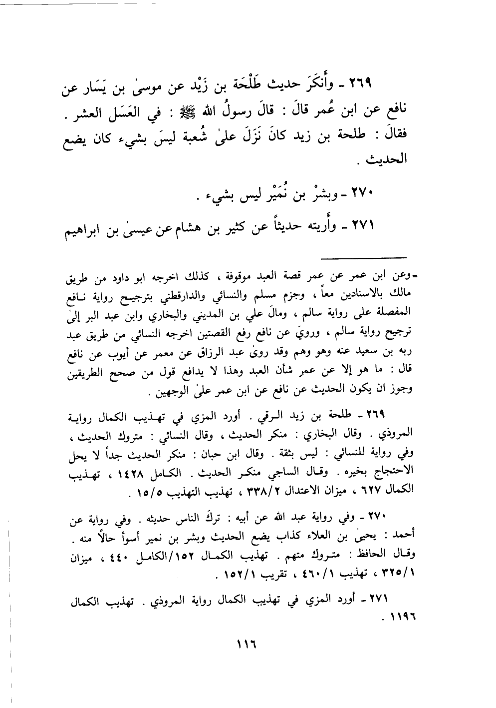 269 - وَأَنْكَرَ حَدِيثَ طَلْحَةَ بْنِ زَيْدٍ عَنْ مُوسَى بْنِ يَسَارٍ عَنْ نَافِعٍ عَنِ ابْنِ عُمَرَ قَالَ قَالَ رَسُولُ اللَّهِ صَلَّى اللَّهُ عَلَيْهِ وَسَلَّمَ فِي الْعَسَلِ الْعُشْرُ فَقَالَ طَلْحَةُ بْنُ زَيْدٍ كَانَ نَزَلَ عَلَى شُعْبَةَ لَيْسَ بِشَيْءٍ كَانَ يضع الحَدِيث