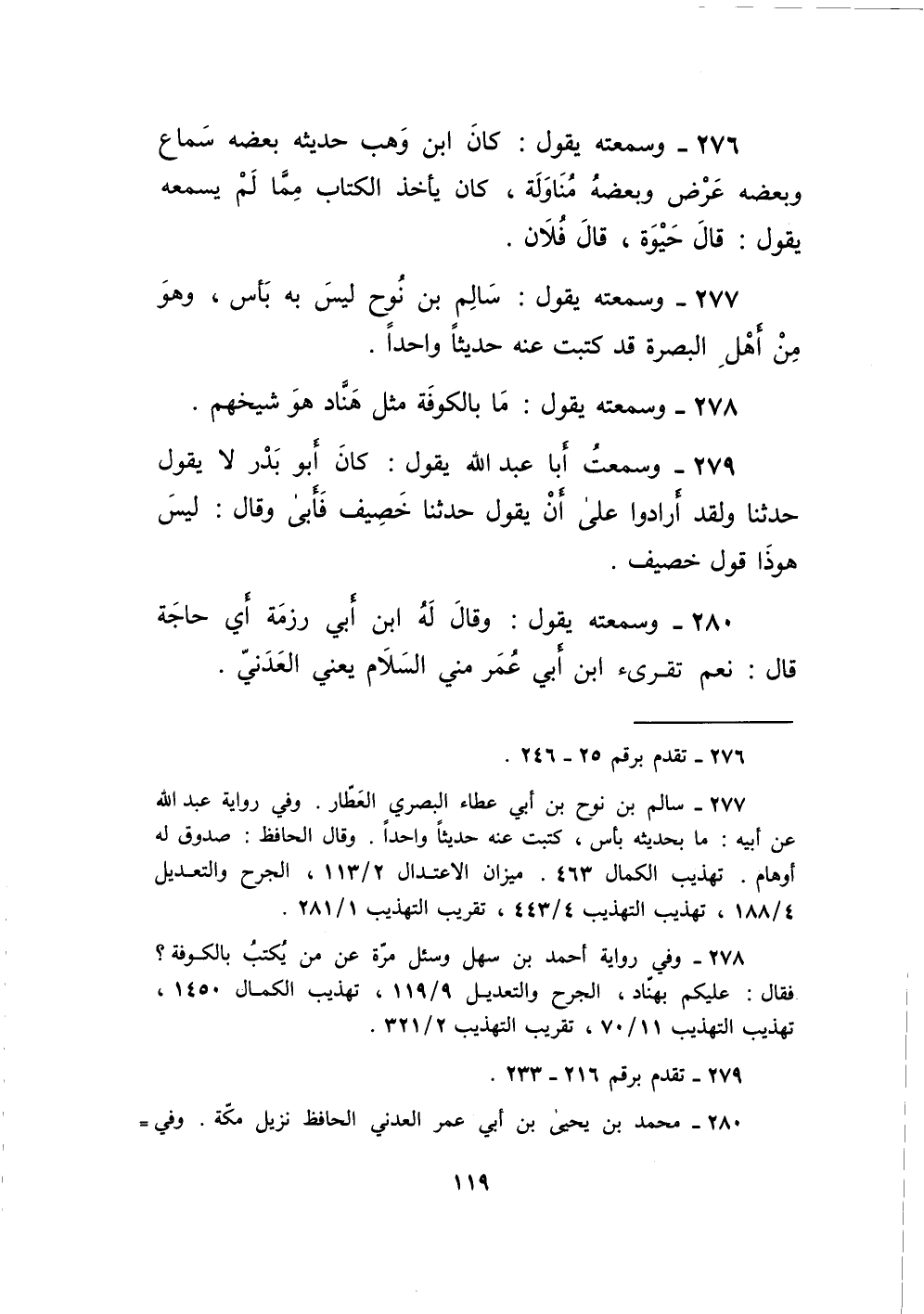 279 - وَسمعت أَبَا عبد الله يَقُول كَانَ أَبُو بدر لَا يَقُول حَدثنَا وَلَقَد أَرَادوا على أَن يَقُول حَدثنَا خصيف فَأبى وَقَالَ لَيْسَ هوذا قَول خصيف