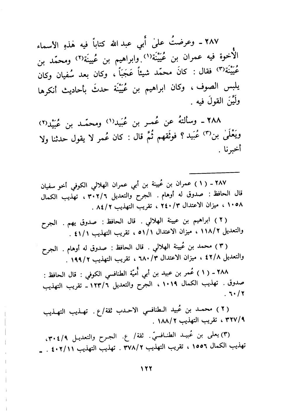 287 - وَعرضت على أبي عبد الله كتابا فِيهِ هَذِه الْأَسْمَاء الْإِخْوَة فِيهِ عمرَان بن عُيَيْنَة وَإِبْرَاهِيم بن عُيَيْنَة وَمُحَمّد بن عُيَيْنَة فَقَالَ كَانَ مُحَمَّد شَيْئا عجبا وَكَانَ بعد سُفْيَان وَكَانَ يلبس الصُّوف وَكَانَ إِبْرَاهِيم بن عُيَيْنَة حدث بِأَحَادِيث أنكرها ولين القَوْل فِيهِ