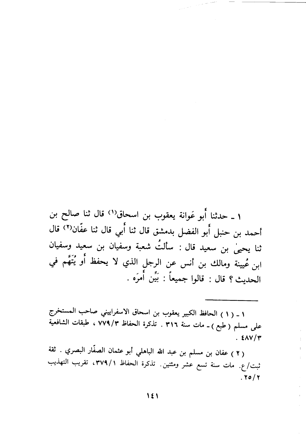 1 - حَدثنَا أَبُو عوَانَة يَعْقُوب بن إِسْحَاق قَالَ ثَنَا صَالح بن أَحْمد بن حَنْبَل أَبُو الْفضل بِدِمَشْق قَالَ ثَنَا أبي قَالَ ثَنَا عَفَّان قَالَ ثَنَا يحيى بن سعيد قَالَ سَأَلت شُعْبَة وسُفْيَان بن سعيد وسُفْيَان ابْن عُيَيْنَة وَمَالك بن أنس عَن الرجل الَّذِي لَا يحفظ أَو يتهم فِي الحَدِيث قَالَ قَالُوا جَمِيعًا بَين أمره