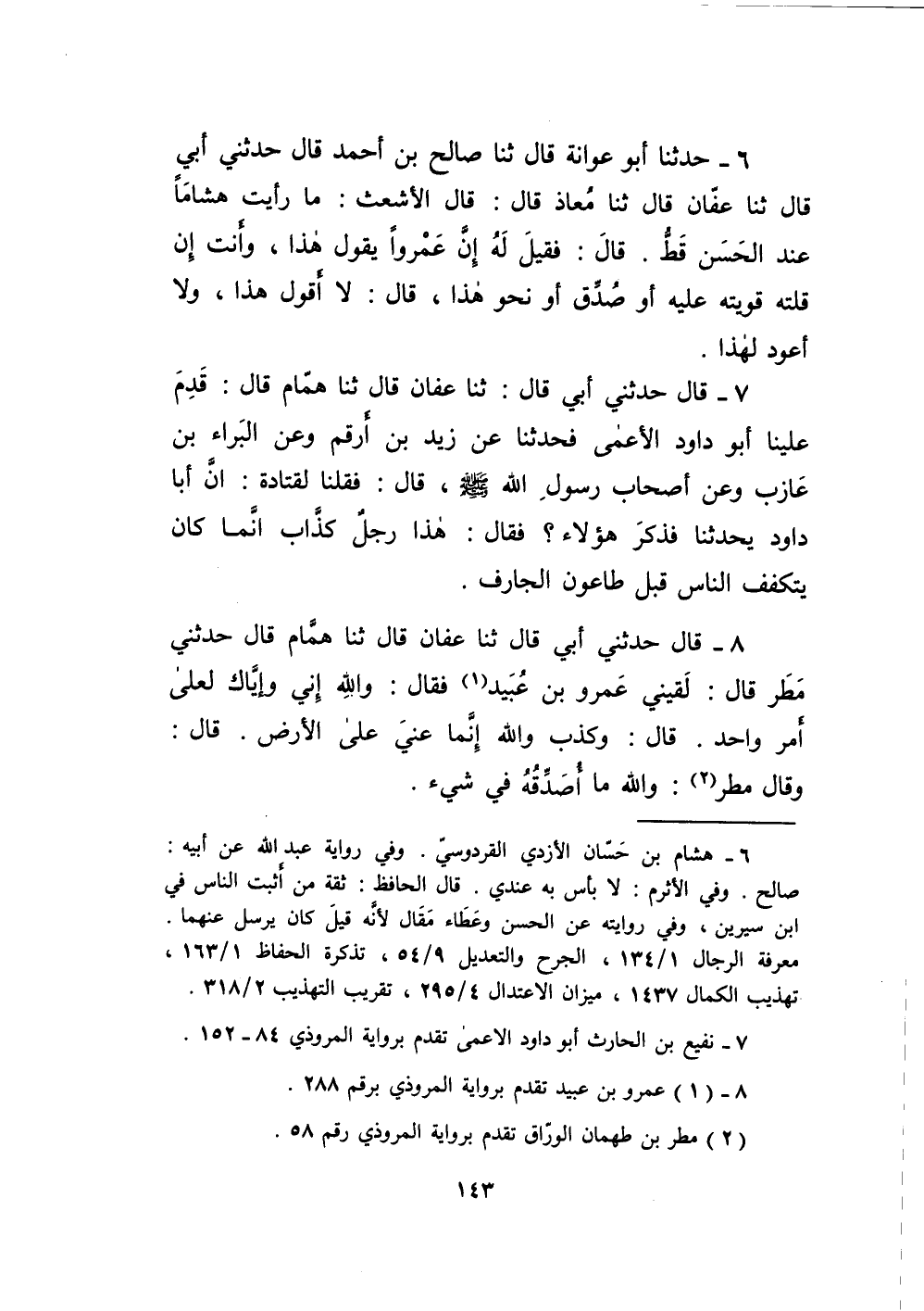 6 - حَدثنَا أَبُو عوَانَة قَالَ ثَنَا صَالح بن أَحْمد قَالَ حَدثنِي أبي قَالَ ثَنَا عَفَّان قَالَ ثَنَا معَاذ قَالَ قَالَ الْأَشْعَث مَا رَأَيْت هشاما عِنْد الْحسن قطّ قَالَ فَقيل لَهُ إِن عمروا يَقُول هَذَا وَأَنت إِن قلته قويته عَلَيْهِ أَو صدق أَو نَحْو هَذَا قَالَ لَا أَقُول هَذَا وَلَا أَعُود لهَذَا