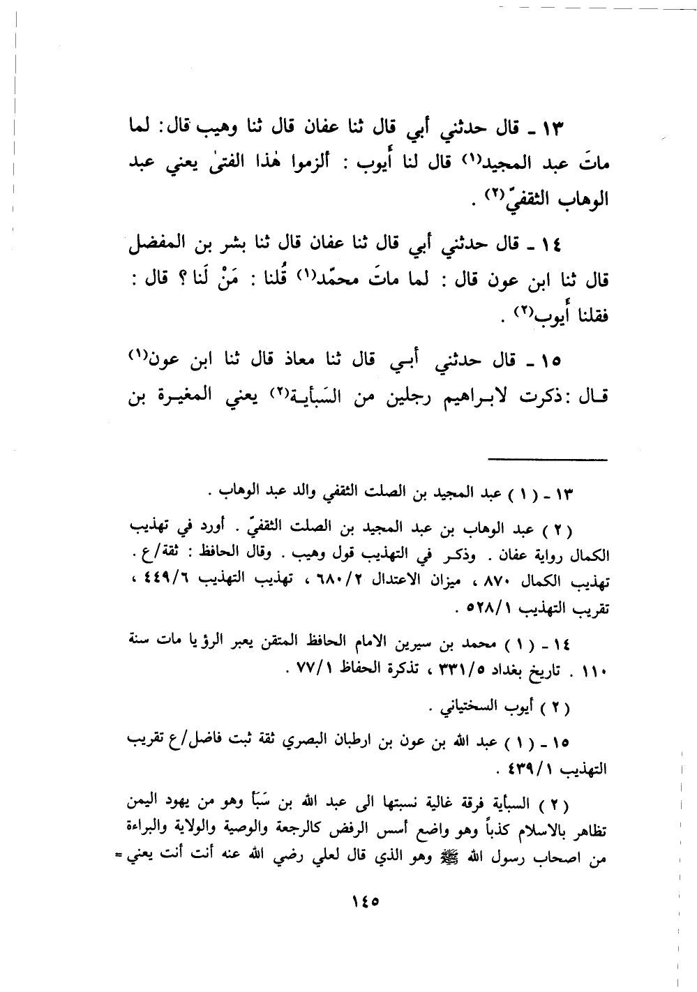 13 - قَالَ حَدثنِي أبي قَالَ ثَنَا عَفَّان قَالَ ثَنَا وهيب قَالَ لما مَاتَ عبد الْمجِيد قَالَ لنا أَيُّوب الزموا هَذَا الْفَتى يَعْنِي عبد الْوَهَّاب الثَّقَفِيّ