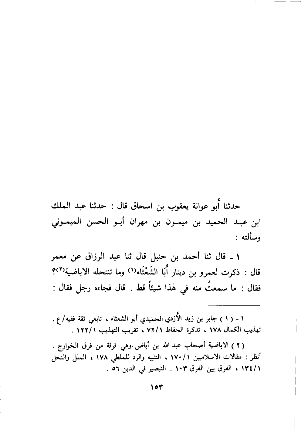 1 - قَالَ ثَنَا أَحْمد بن حَنْبَل قَالَ ثَنَا عَبْدُ الرَّزَّاقِ عَنْ مَعْمَرٍ قَالَ ذَكَرْتُ لِعَمْرِو بْنِ دِينَارٍ أَبَا الشَّعْثَاءِ وَمَا تَنْتَحِلُهُ الْإِبَاضِيَّةُ فَقَالَ مَا سَمِعْتُ مِنْهُ فِي هَذَا شَيْئًا قطّ قَالَ فَجَاءَهُ رجل فَقَالَ