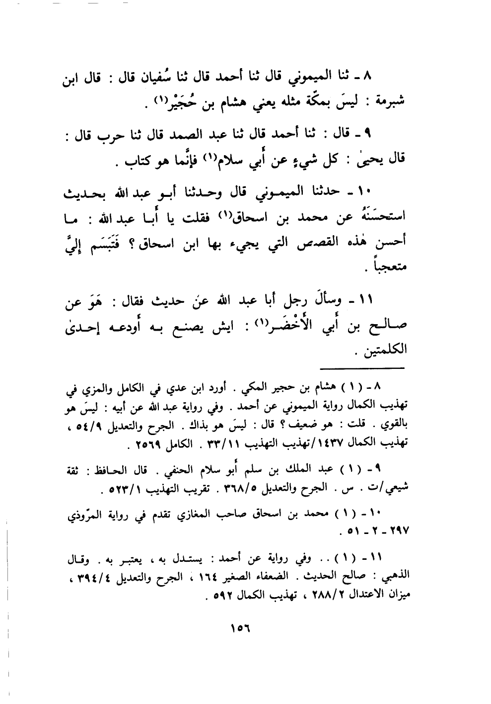 10 - حَدثنَا الْمَيْمُونِيّ قَالَ وَحدثنَا أَبُو عبد الله بِحَدِيث استحسنه عَن مُحَمَّد بن إِسْحَاق فَقلت يَا أَبَا عبد الله مَا أحسن هَذِه الْقَصَص الَّتِي يَجِيء بهَا ابْن إِسْحَاق فَتَبَسَّمَ إِلَيّ مُتَعَجِّبا