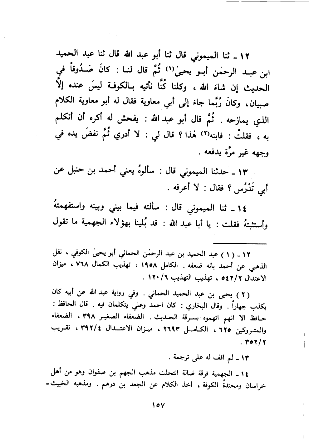 14 - ثَنَا الْمَيْمُونِيّ قَالَ سَأَلته فِيمَا بيني وَبَينه واستفهمته وأستثبته فَقلت يَا أَبَا عبد الله قد بلينا بهؤلاء الْجَهْمِية مَا تَقول