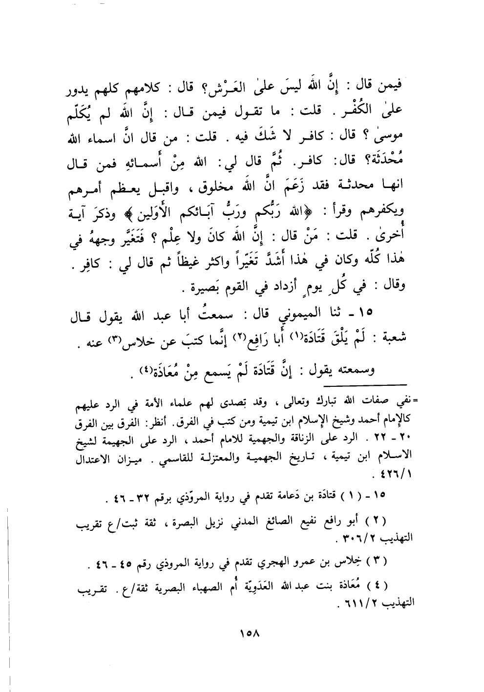 فِيمَن قَالَ إِن الله لَيْسَ على الْعَرْش قَالَ كَلَامهم كلهم يَدُور على الْكفْر قلت مَا تَقول فِيمَن قَالَ إِن الله لم يكلم مُوسَى قَالَ كَافِر لَا شكّ فِيهِ قلت من قَالَ إِن أَسمَاء الله محدثة قَالَ كَافِر ثمَّ قَالَ لي الله من أَسْمَائِهِ فَمن قَالَ إِنَّهَا محدثة فقد زعم أَن الله مَخْلُوق وَأَقْبل يعظم أَمرهم ويكفرهم وَقَرَأَ {الله ربكُم وَرب آبائكم الْأَوَّلين} وَذكر آيَة أُخْرَى قلت من قَالَ إِن الله كَانَ وَلَا علم فَتغير وَجهه فِي هَذَا كُله وَكَانَ فِي هَذَا أَشد تغيرا وَأكْثر غيظا ثمَّ قَالَ لي كَافِر وَقَالَ فِي كل يَوْم أزداد فِي الْقَوْم بَصِيرَة