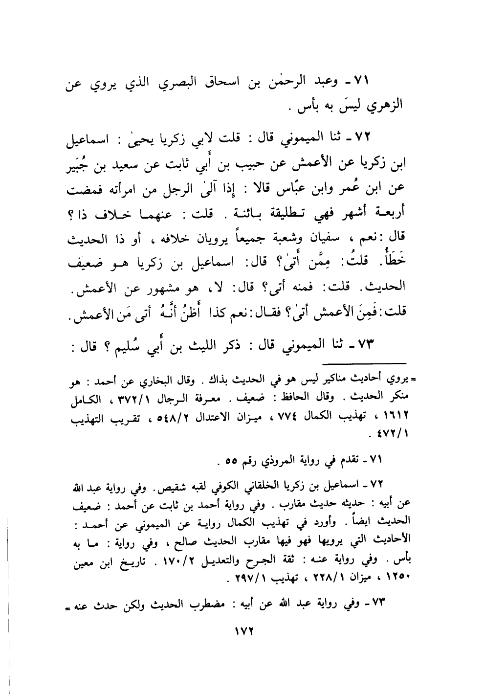 72 - ثَنَا الْمَيْمُونِيُّ قَالَ قُلْتُ لأَبِي زَكَرِيَّا يَحْيَى إِسْمَاعِيلَ ابْن زَكَرِيَّا عَنِ الأَعْمَشِ عَنْ حَبِيبِ بْنِ أَبِي ثَابِتٍ عَنْ سَعِيدِ بْنِ جُبَيْرٍ عَنِ ابْنِ عُمَرَ وَابْنِ عَبَّاسٍ قَالا إِذَا آلَى الرَّجُلُ مِنَ امْرَأَتِهِ فَمَضَتْ أَرْبَعَةُ أَشْهُرٍ فَهِيَ تَطْلِيقَةٌ بَائِنَةٌ قلت عَنْهُمَا خلاف ذَا قَالَ نعم سُفْيَان وَشعْبَة جَمِيعًا يرويان خِلَافه أَو ذَا الحَدِيث خطأ قلت مِمَّن أُتِي قَالَ إِسْمَاعِيل بن زَكَرِيَّا هُوَ ضَعِيف الحَدِيث قلت فَمِنْهُ أَتَى قَالَ لَا هُوَ مَشْهُور عَن الْأَعْمَش قلت فَمن الْأَعْمَش أَتَى فَقَالَ نعم كَذَا أَظن أَنه أَتَى من الْأَعْمَش