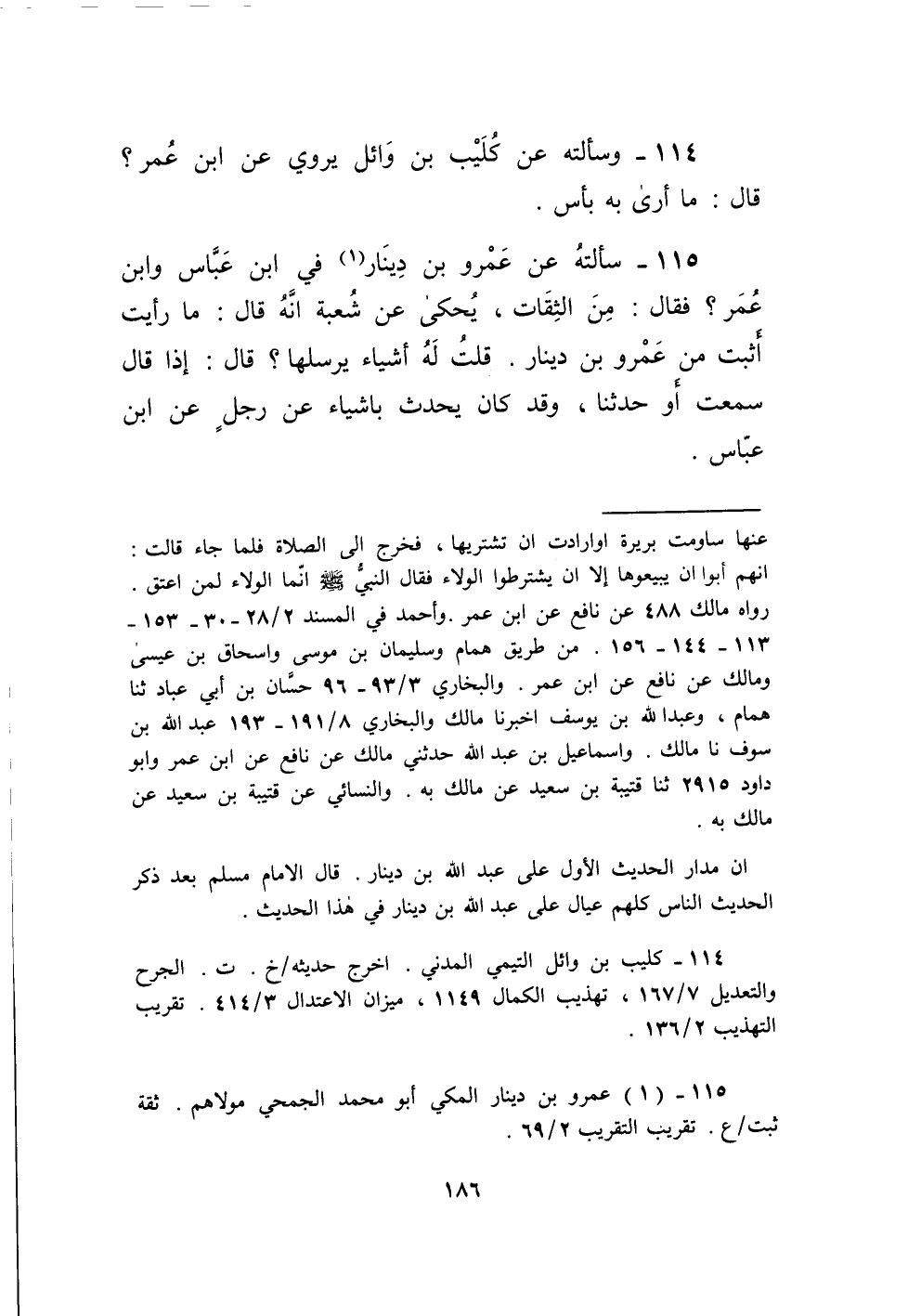 115 - سَأَلته عَن عَمْرو بن دِينَار فِي ابْن عَبَّاس وَابْن عمر فَقَالَ من الثِّقَات يَحْكِي عَن شُعْبَة أَنه قَالَ مَا رَأَيْت أثبت من عَمْرو بن دِينَار قلت لَهُ أَشْيَاء يرسلها قَالَ إِذا قَالَ سَمِعت أَو حَدثنَا وَقد كَانَ يحدث بأَشْيَاء عَن رجل عَن ابْن عَبَّاس